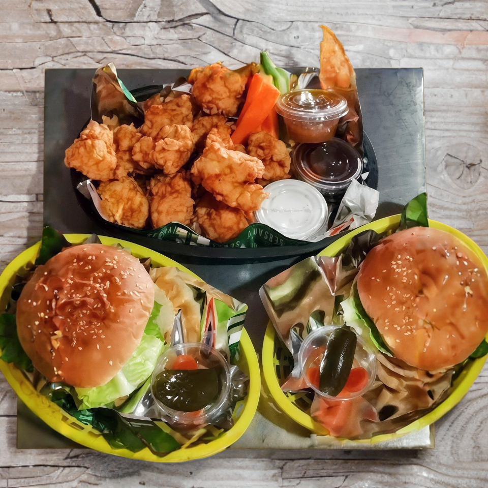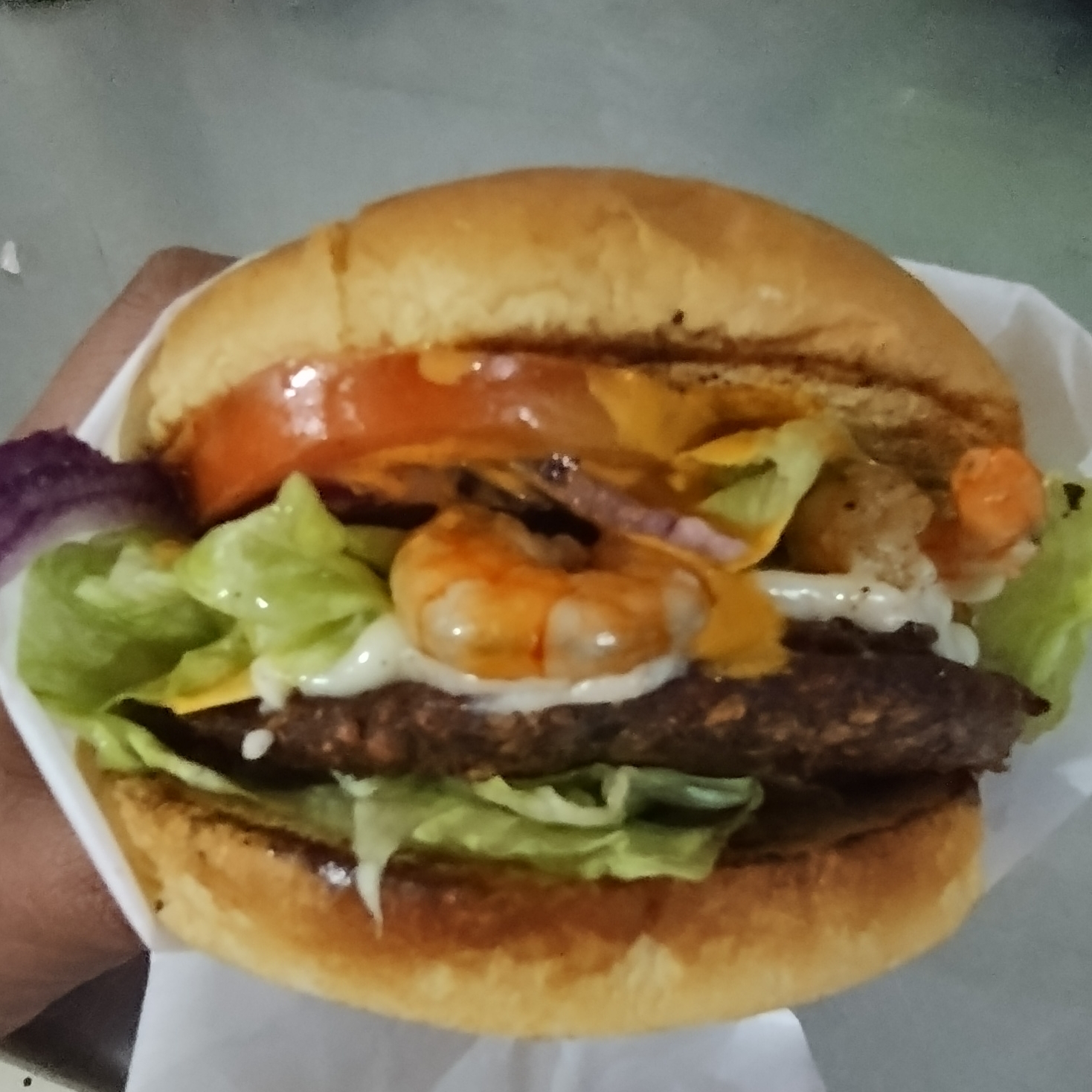 Delicioso y suavecito pan brioche, 1/4 de verdadera carne sirloin,queso menonita,camarones,aguacate,lechuga, cebolla morada,tomate
