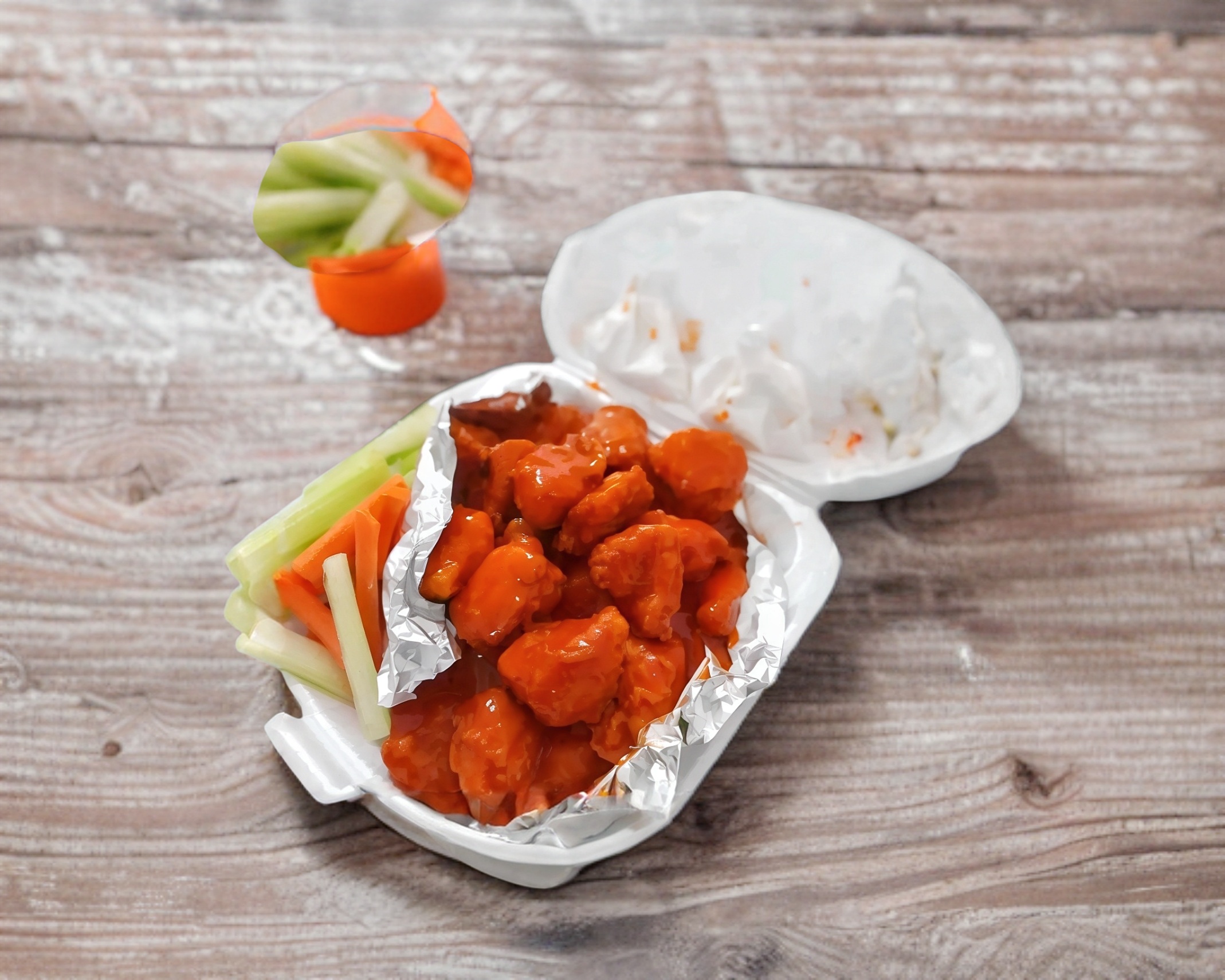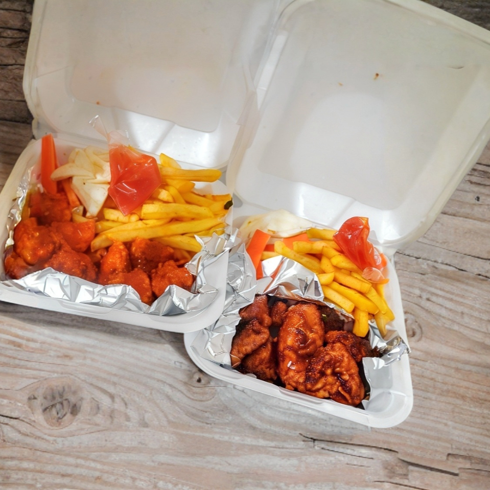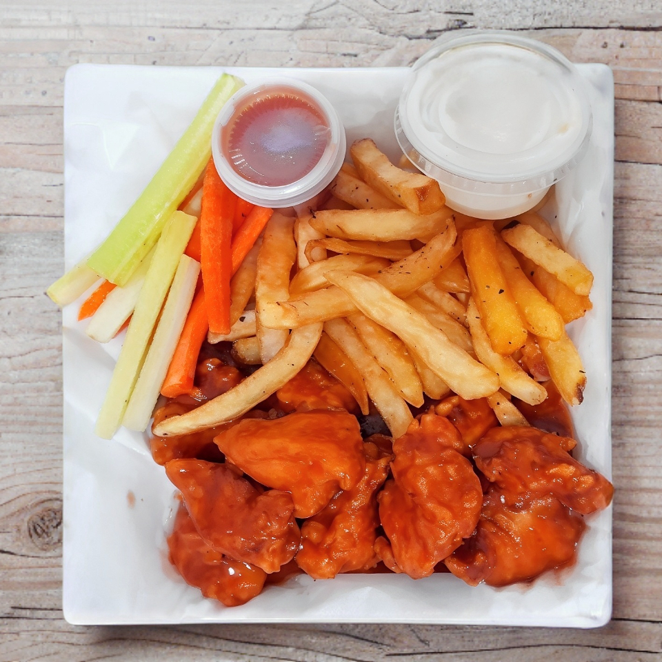 Deliciosos trozos de pura pechuga (7-8-pzas)bien bañados en tu salsa favorita, acompañados de papas fritas, apio zanahoria, ranch y catsup