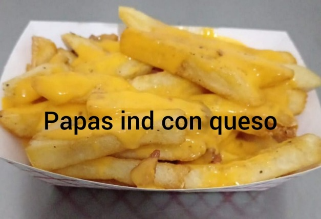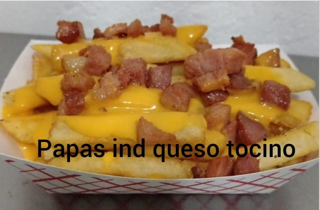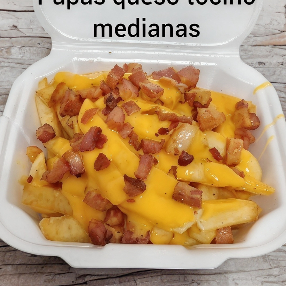250gr de papas fritas bañadas de queso cheddar encima deliciosos trozos de tocino