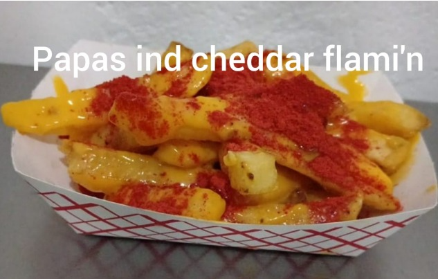 Papas fritas bañadas con queso cheddar , espolvoreadas con sazonador flamihot
