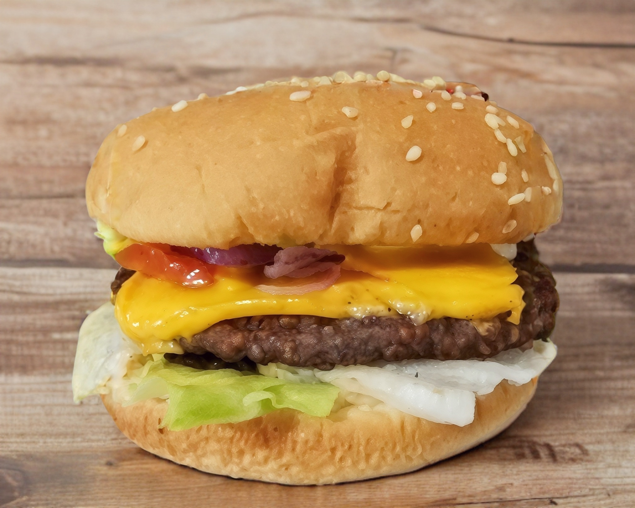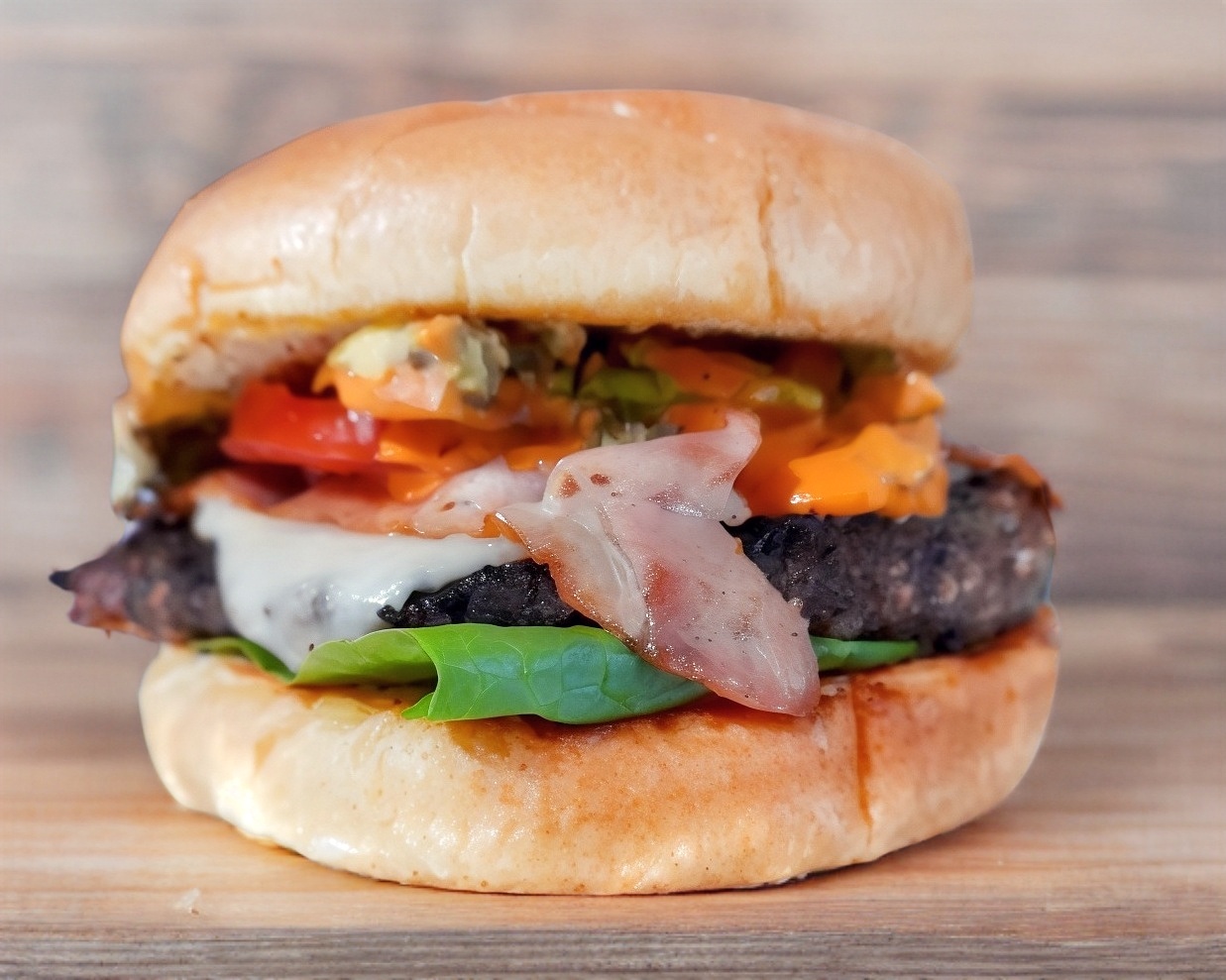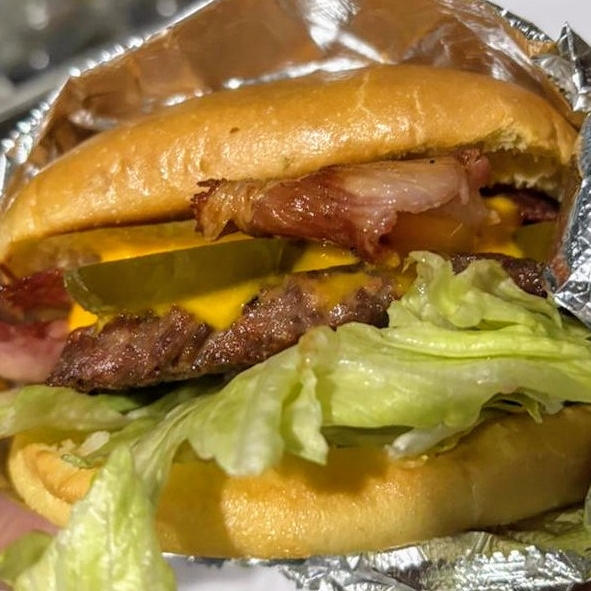 Delicioso y suavecito pan brioche,1/4 de verdadera carne sirloin, tocino,queso cheddar derretido, jalapeños curtidos,lechuga