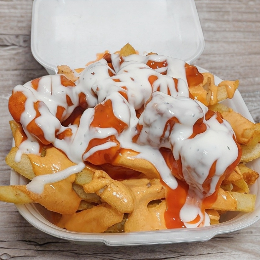 180gr de papas fritas bañadas de queso cheddar, encima boneless bañados en una salsa y ranch