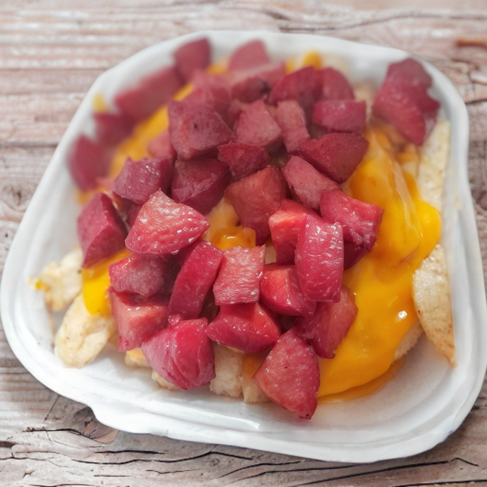 250 te de papas fritas bañadas de queso cheddar encima deliciosos trozos de salchicha para asar