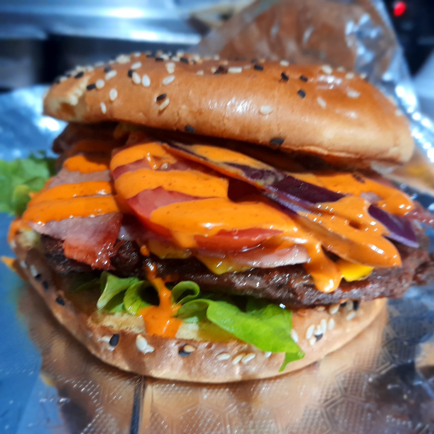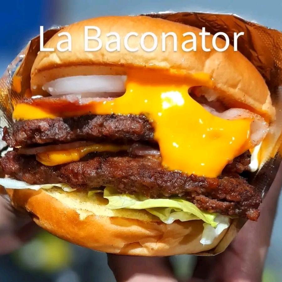 Doble sirloin de 1/4 de libra c /u, , queso amarillo, queso cheddar derretido, 3 tocinos, cebolla,lechuga y mayonesa