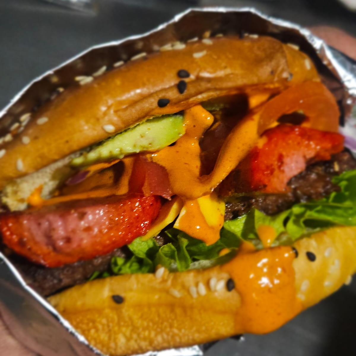 , 1/4 de carne verdadera de sirloin , jamón,, tocino, aguacate, queso amarillo,,lechuga,tomate, aderezo a tu elección