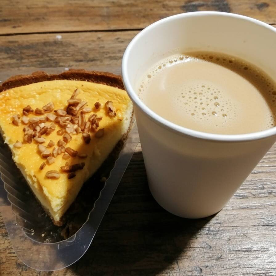 Delicioso pay de queso casero y bebida caliente sabor capuchino de vainilla 12 oz