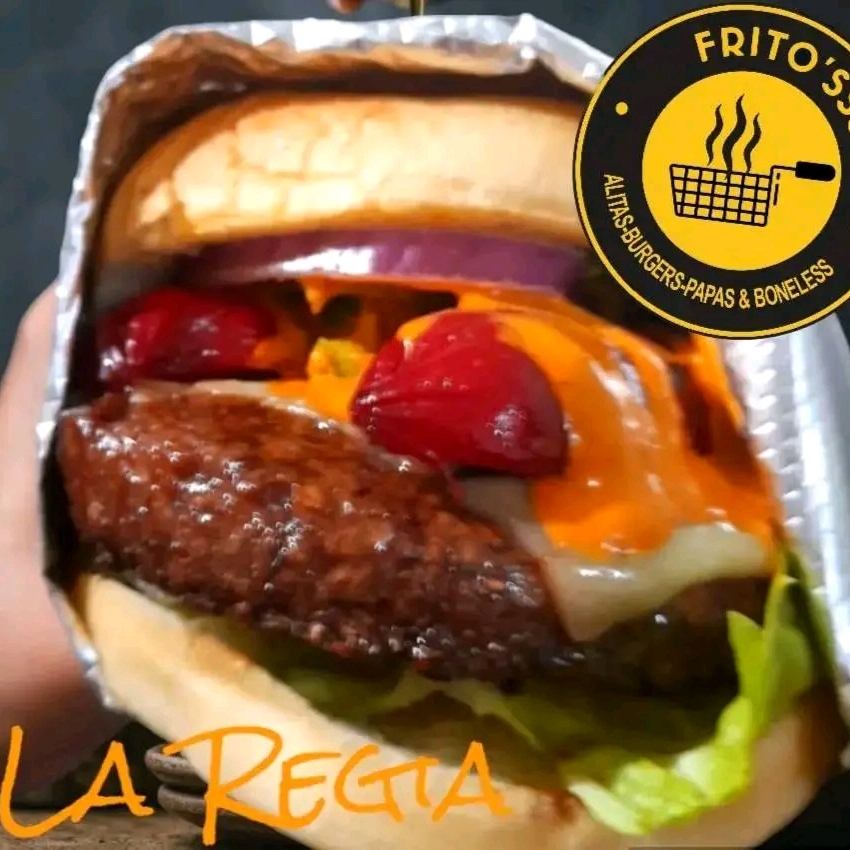 Deliciosa hamburguesa de sirloin ,queso amarillo,pepinillos, lechuga, tomate, cebolla morada, catsup,mayonesa y mostaza. Acompañada de papas fritas catsup