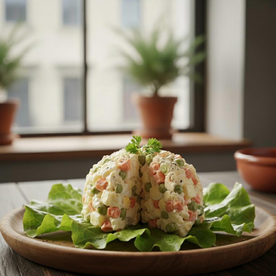 Ensalada fría a base de papa, zanahoria, chicharos cocidos con mayonesa de la casa
