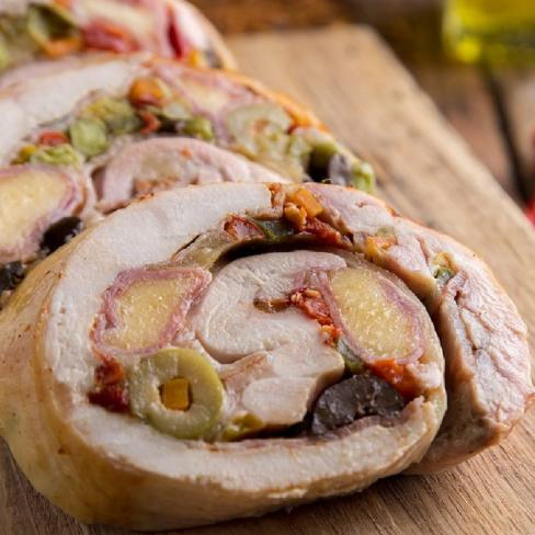 Porción de pollo relleno horneado lleva jamón, queso, huevo duro, aceitunas, morrón rojo y especies.