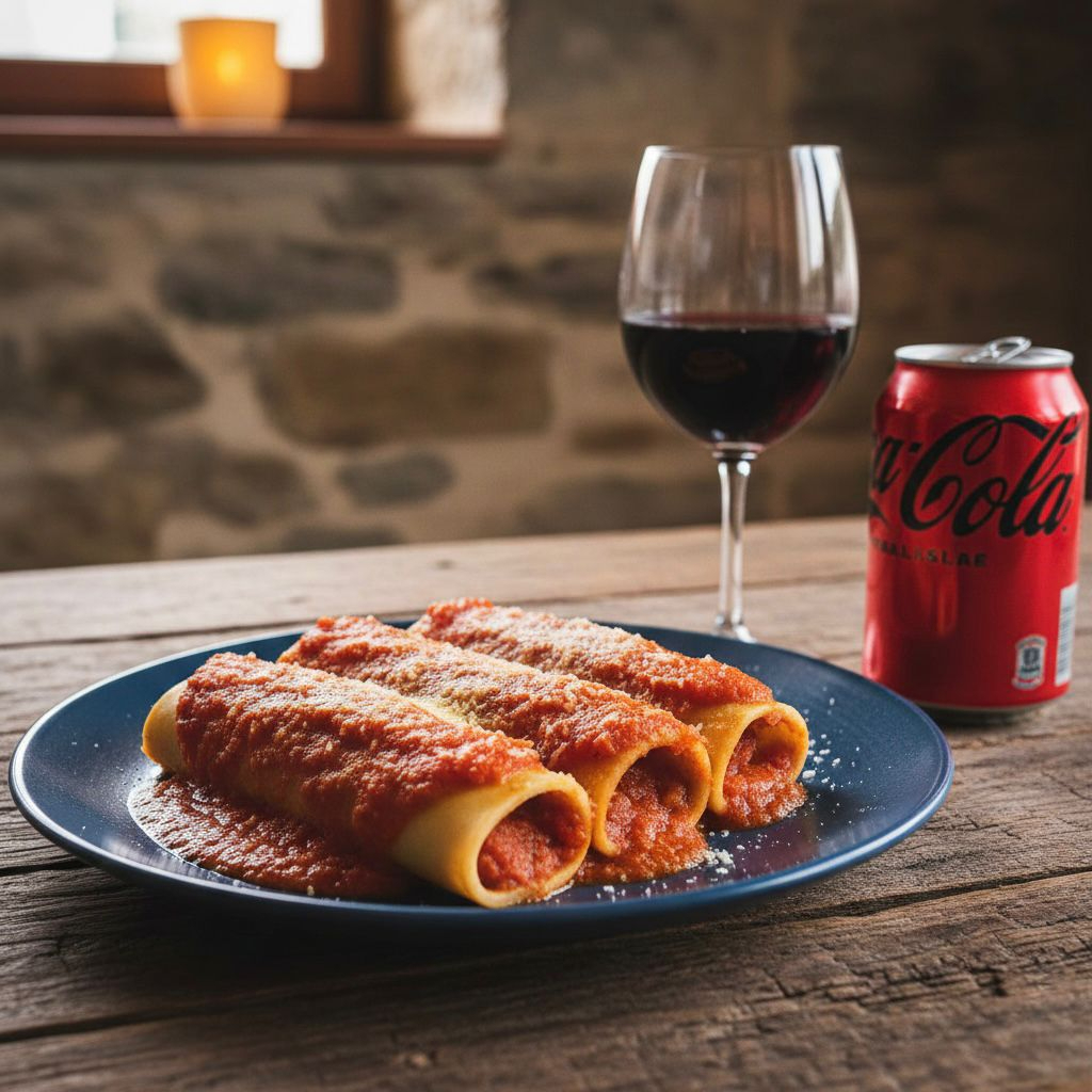 Tres canelones rellenos de carne molida y aderezada con salsa bechamel y bañados en salsa pomodoro