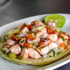 Ceviche de Camaron acompanado de Tostitos, aguacate y salsa Fullenios