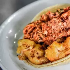 El sabor de camaron, carne de res y costra de queso hecho taco.