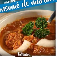 Flautas rellenas de Marlin, cubiertas con queso gratinado y aguacate, banadas con consome de camaron