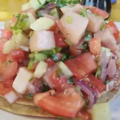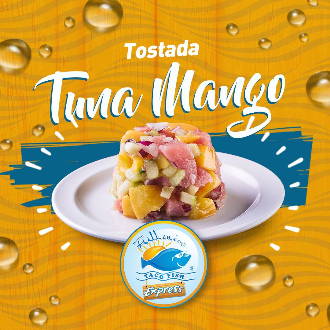 Tostada de ceviche de atun curtido y sazonado con trozos de mango y salsa tropical
