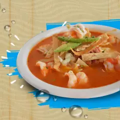 Leche de Tigre (consome bichi), Marlin, Camaron Cocido, Queso, Aguacate y Tiras de tortilla