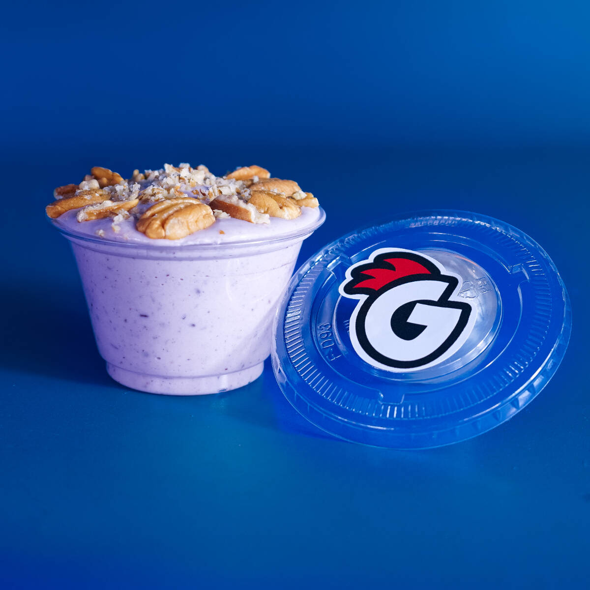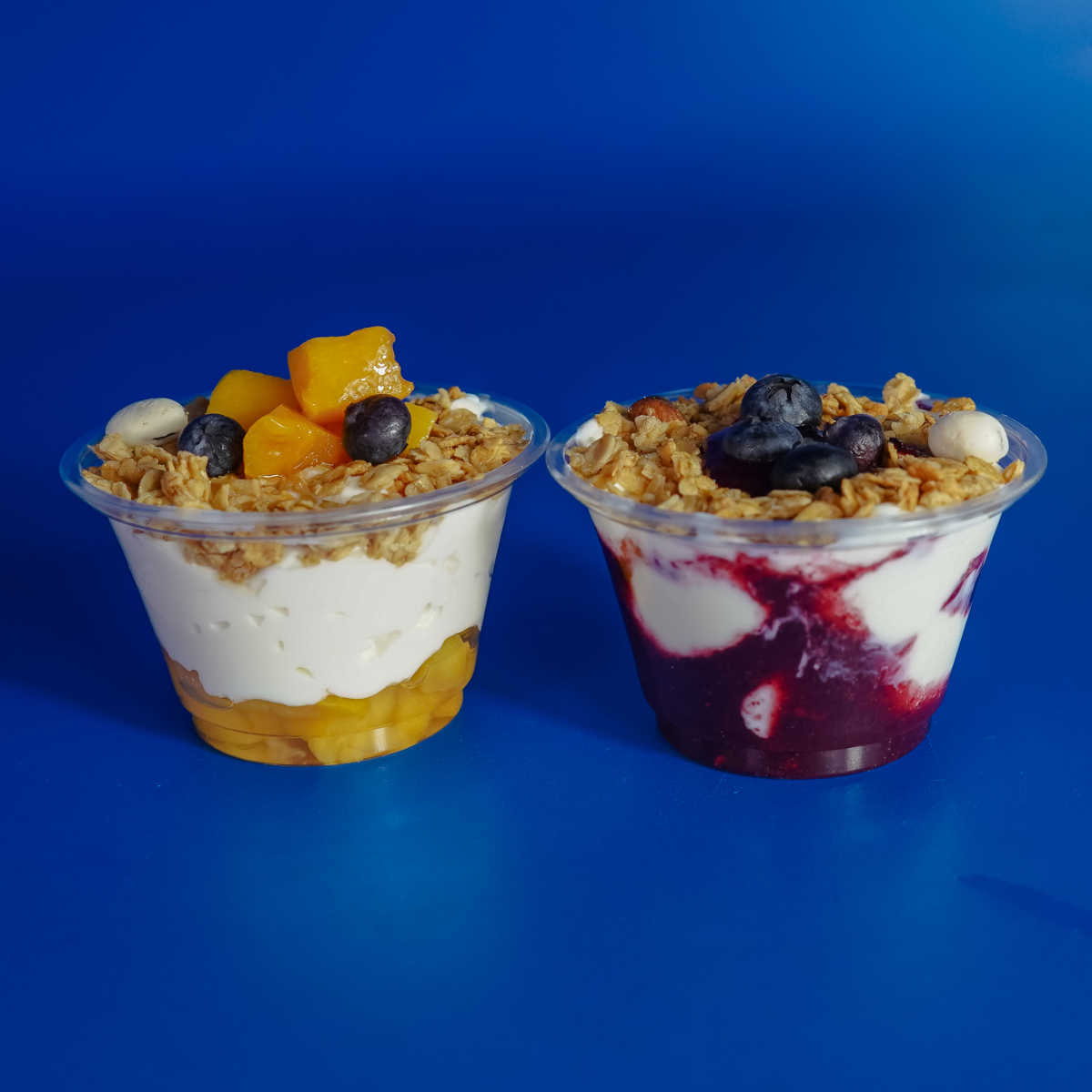 Yogurth griego acompañado de fruta a tu elección con un topping de granola.
