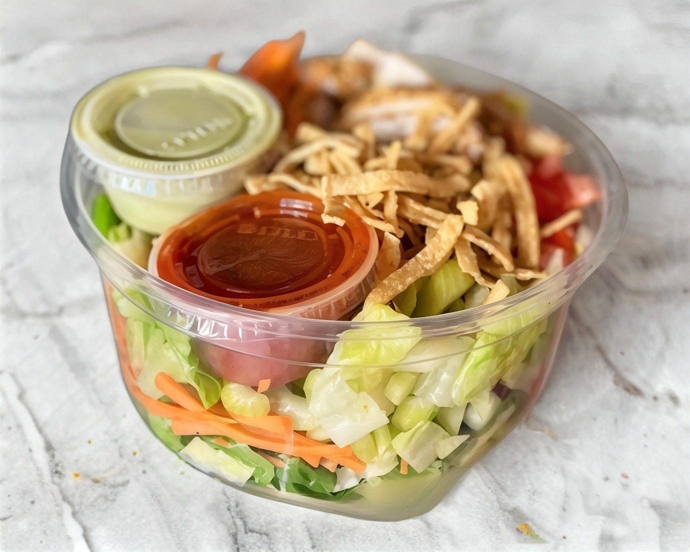 Ensalada de pollo empanizado en avena & amaranto, lechuga, tomate, pepino, zanahoria, apio, frituras de maíz, aderezo cremoso de cilantro y salsa buffalo