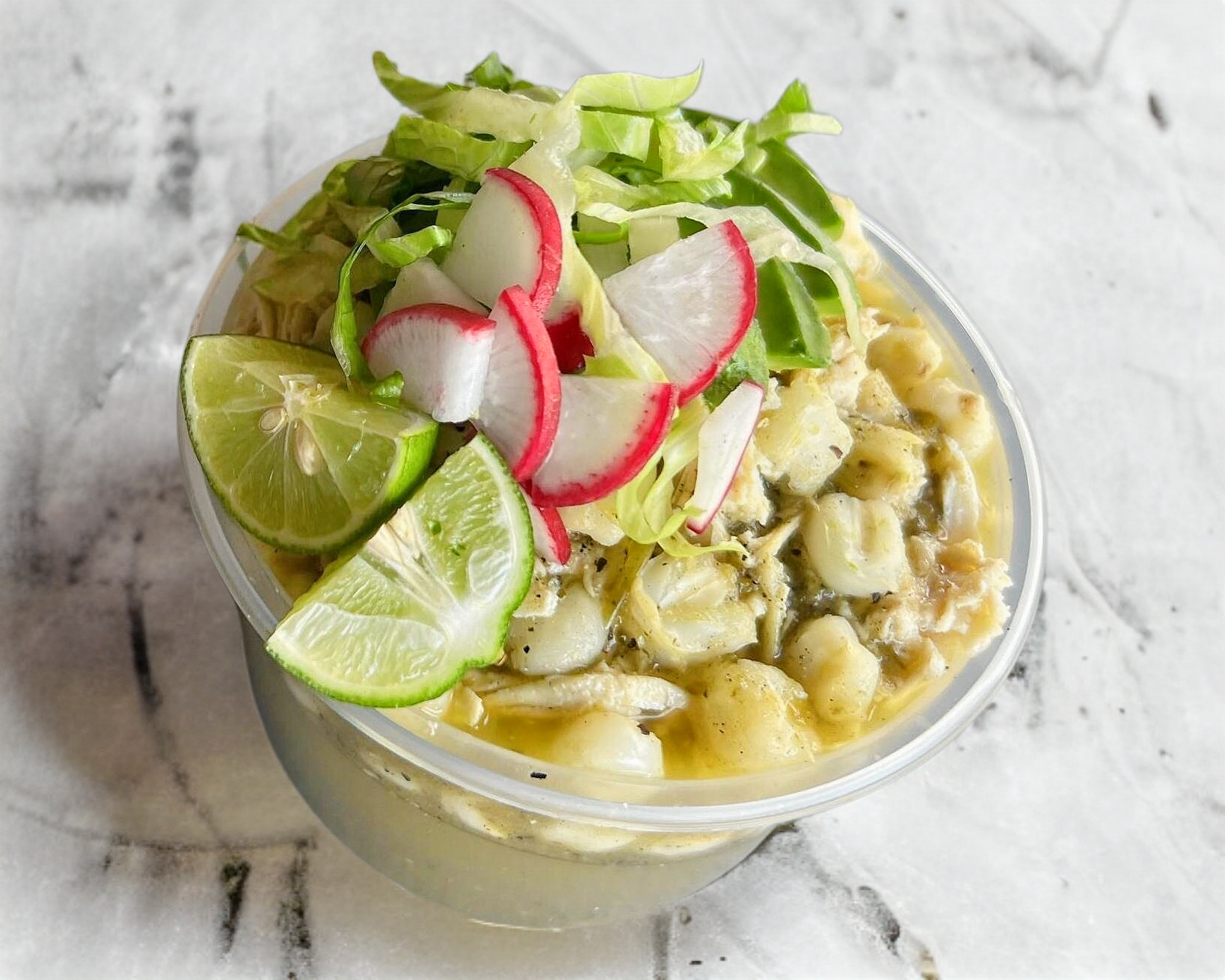 Pozole verde de pollo con aguacate, lechuga, repollo, cilantro, limón, rabanitos y totopos