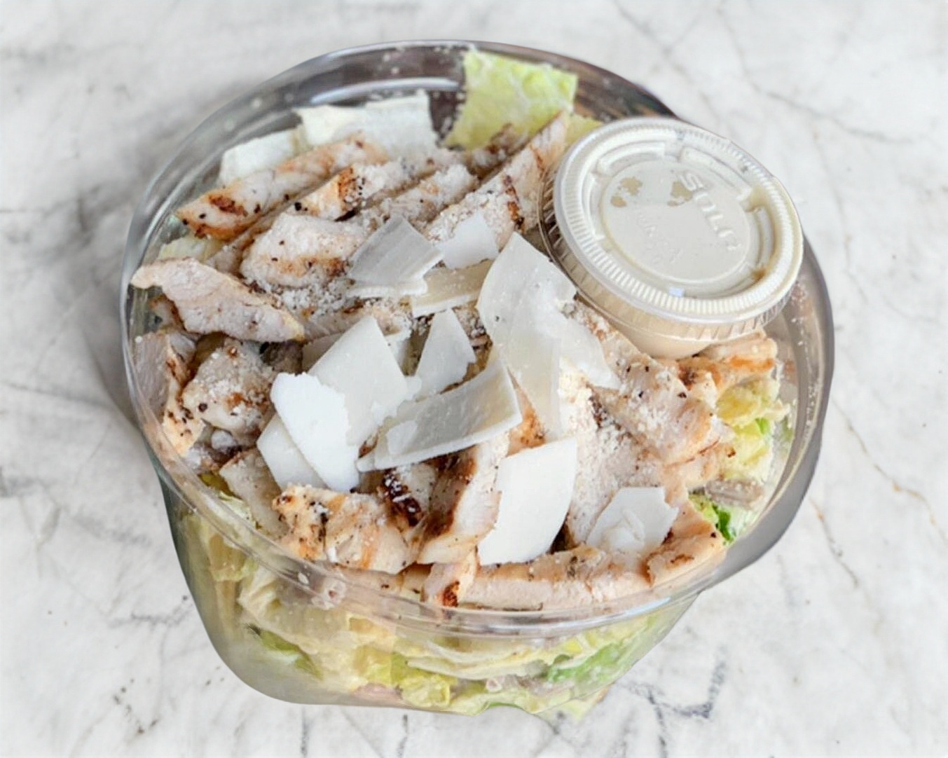 Ensalada césar con pollo, pasta integral, queso parmesano y aderezo hecho en casa