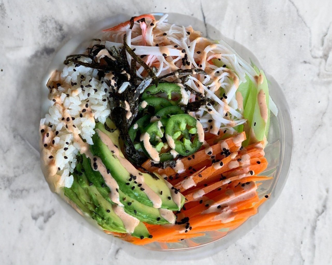 Bowl con base de arroz gohan al vapor, eleción de pollo o surimi, pepino, zanahoria, jalpeño, aguacate, alga nori, salsa spicy, soya preparada