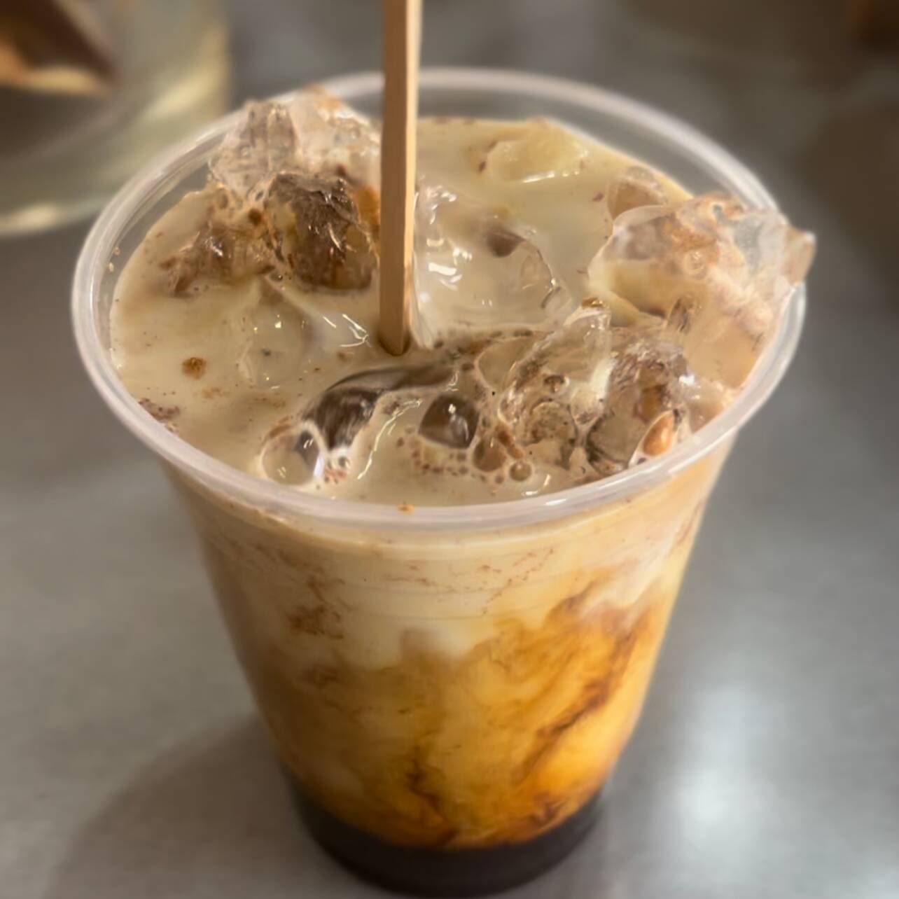 Café helado con 2 shots de espresso, leche de avena y azúcar mascabado