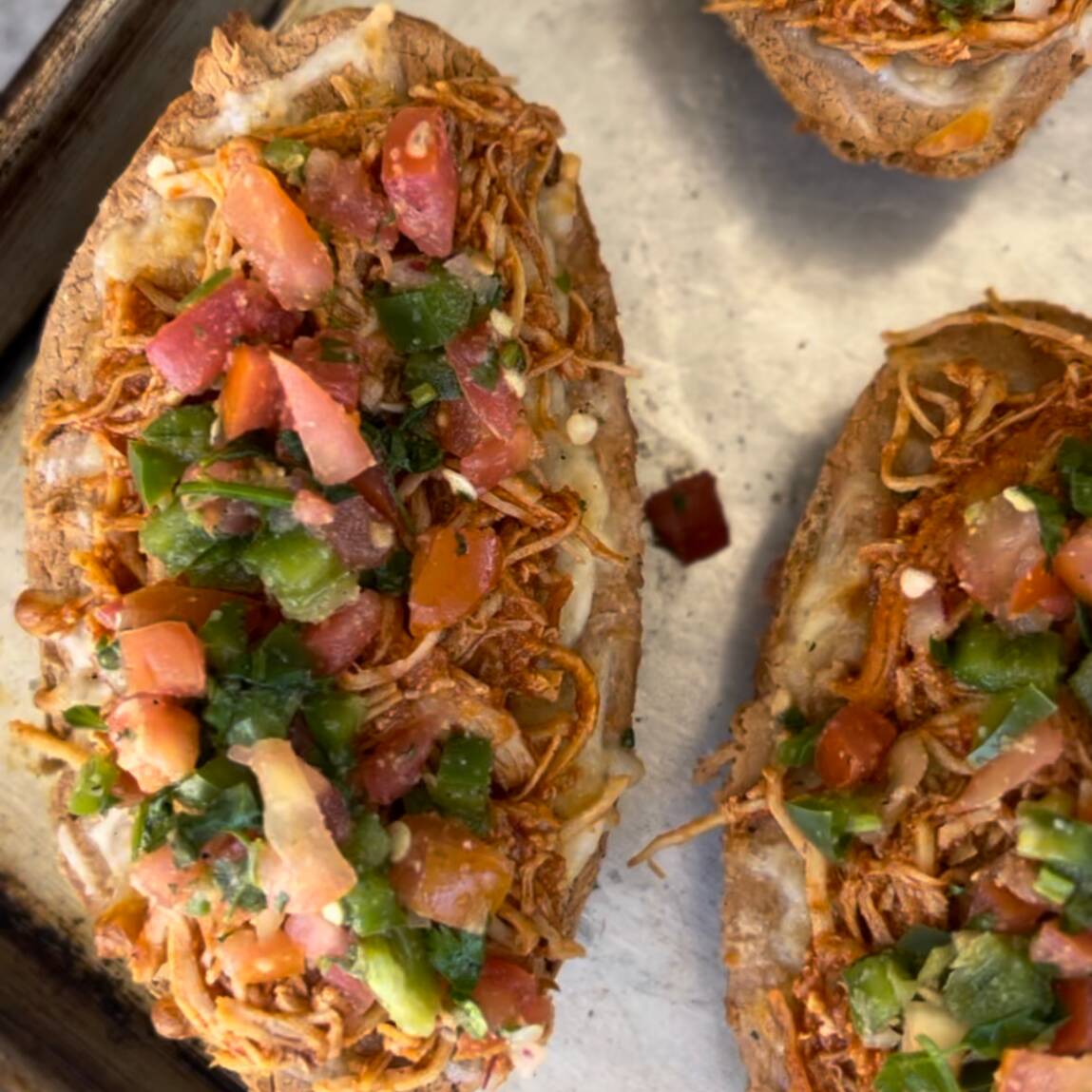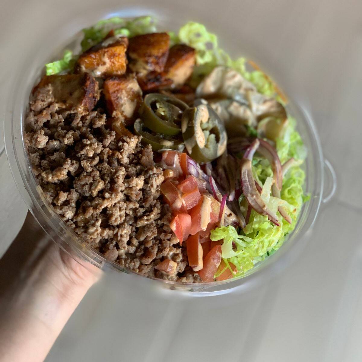Ensalada con base de lechuga, carne molida preparada, papas horneadas, tomate, pepino curtido, cebolla morada, jalapeños y aderezo de la casa
