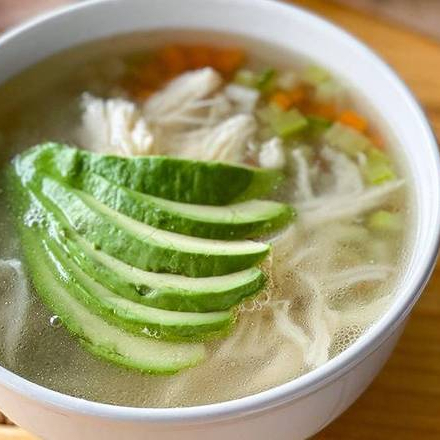 Caldo de pollo con vegetales de temporada. Servido con tu elección de arroz, pechuga de pollo y aguacate. 1/2 LT