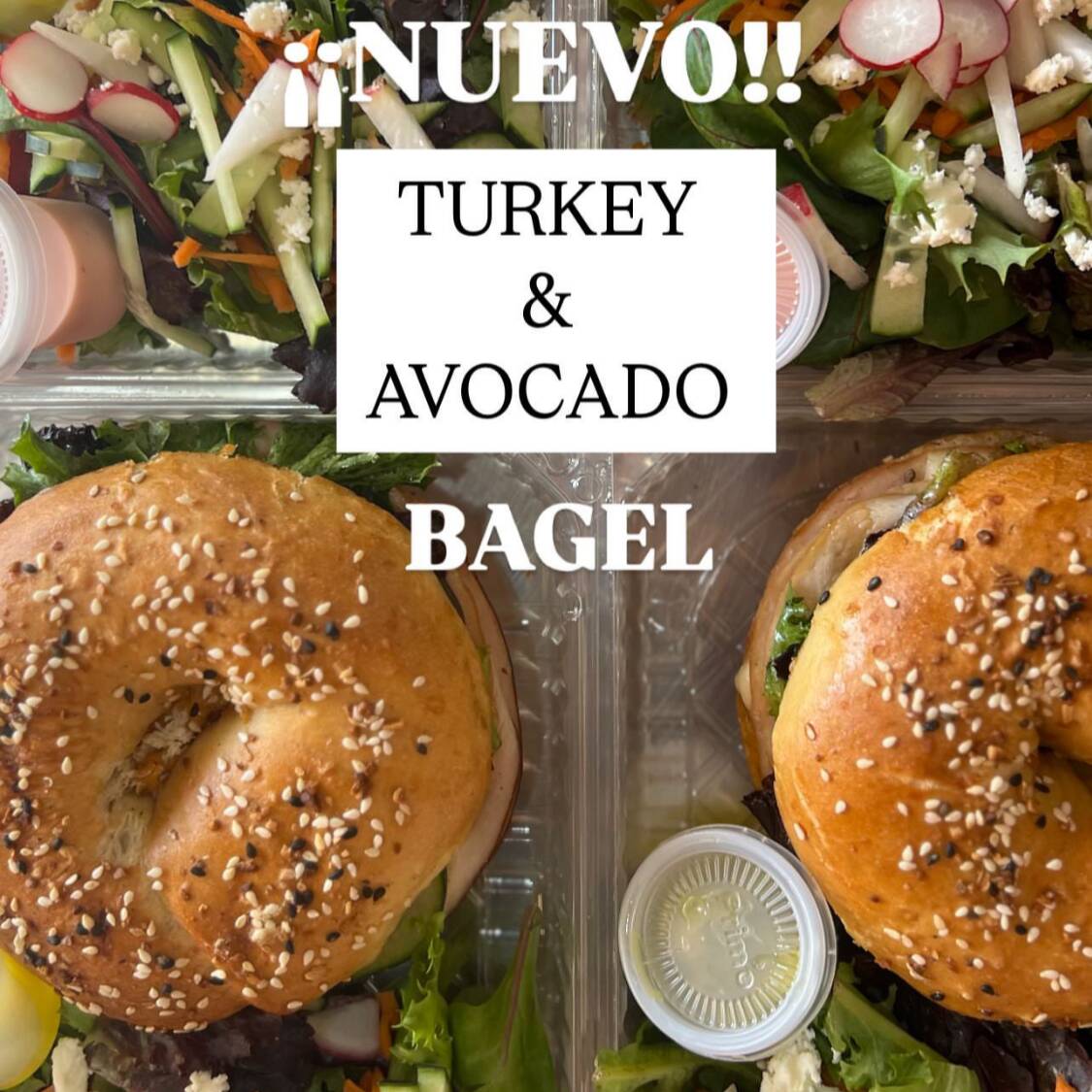 Bagel de pavo, queso, mezcla de verdes, pepino y aguacate en pan de ajo con ajonjolí. Acompañado de papas o ensalada