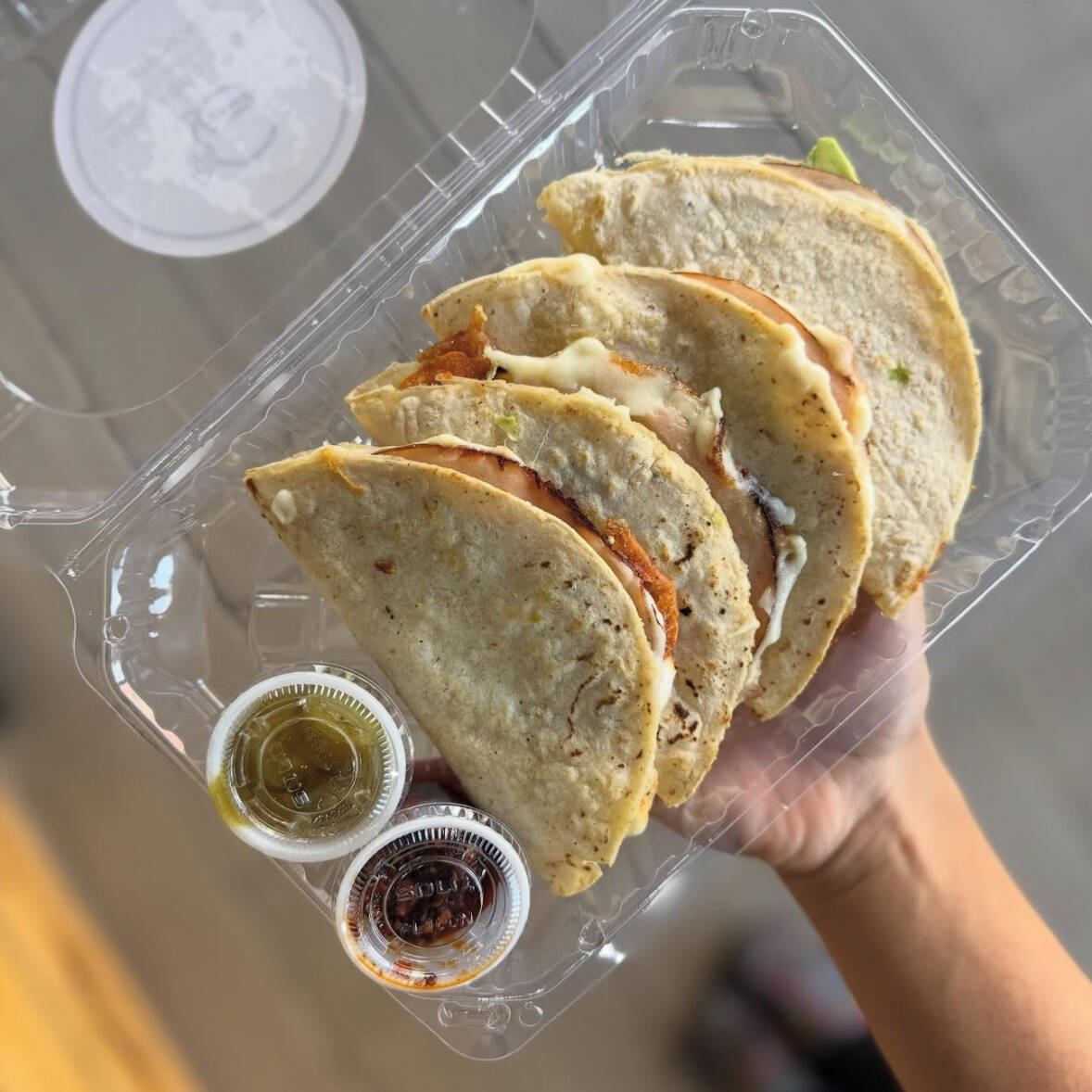 3 tortillas de maíz con queso menonita, pechuga de pavo y aguacate. Acompañadas de salsa verde o salsa macha