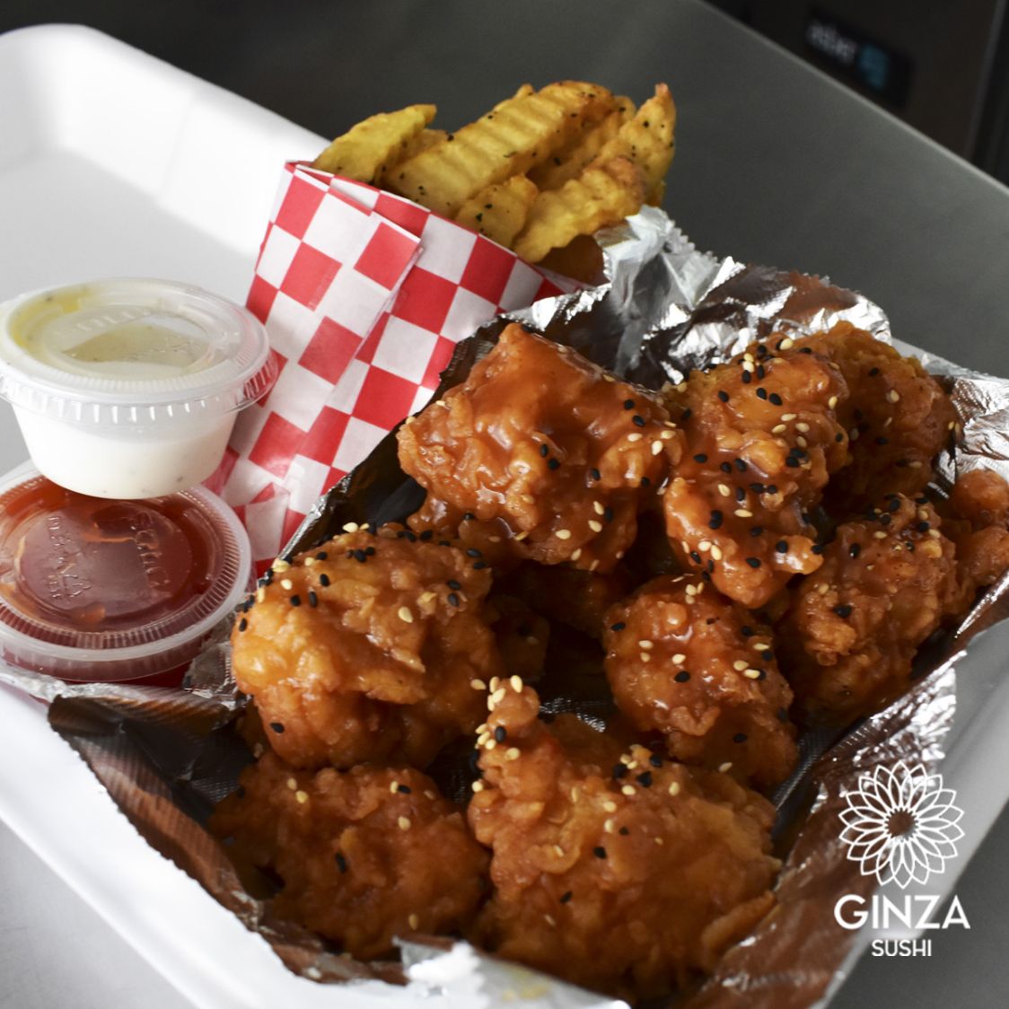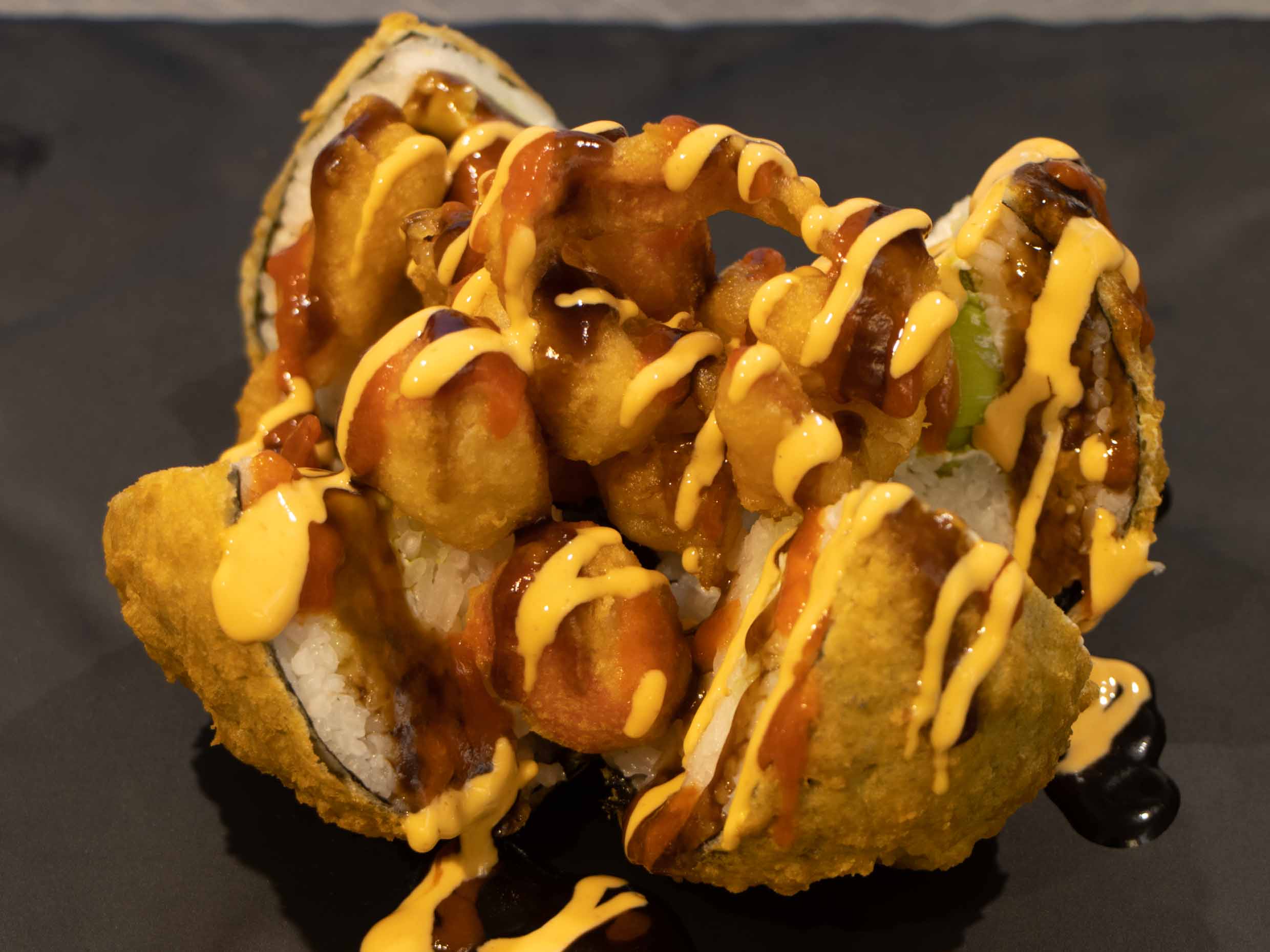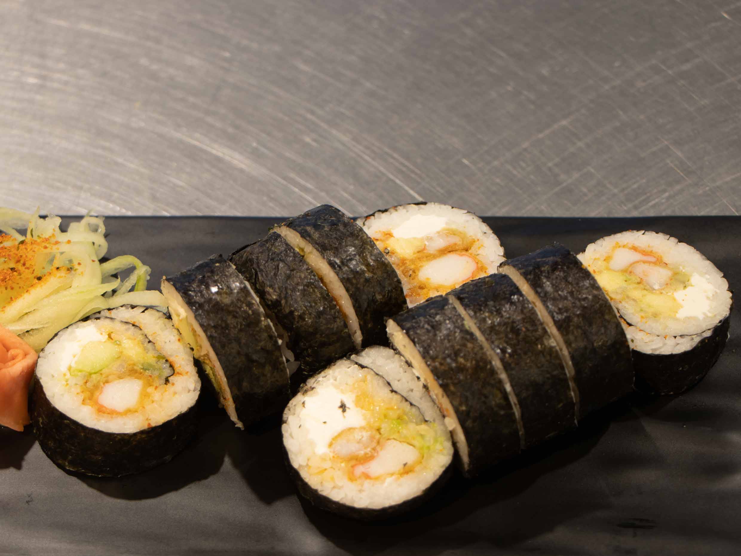Arroz japonés, aguacate, queso crema, camarón empanizado, cangrejo empanizado, salsa siracha, salsa tártara.