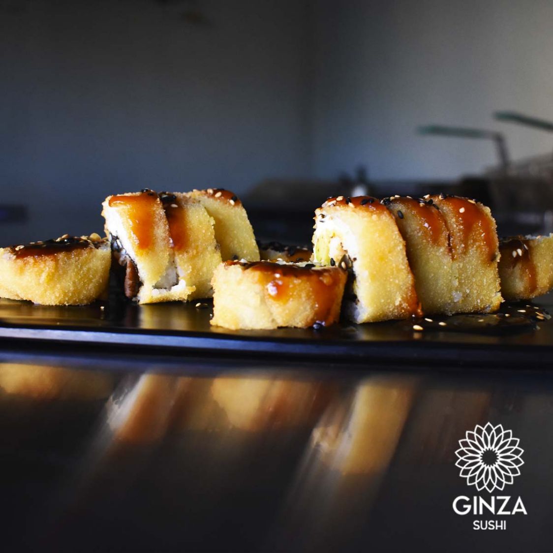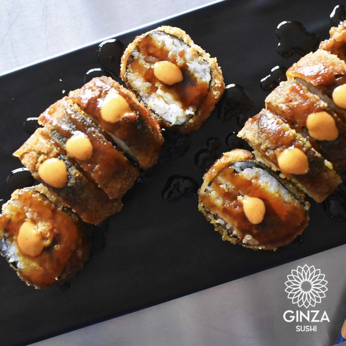 Arroz japonés, tilapia capeado, queso crema, aguacate, siracha, salsa tratara, anguila.