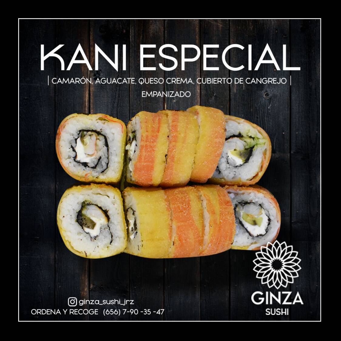 Arroz japonés, camarón, aguacate, queso crema cubierto de cangrejo.