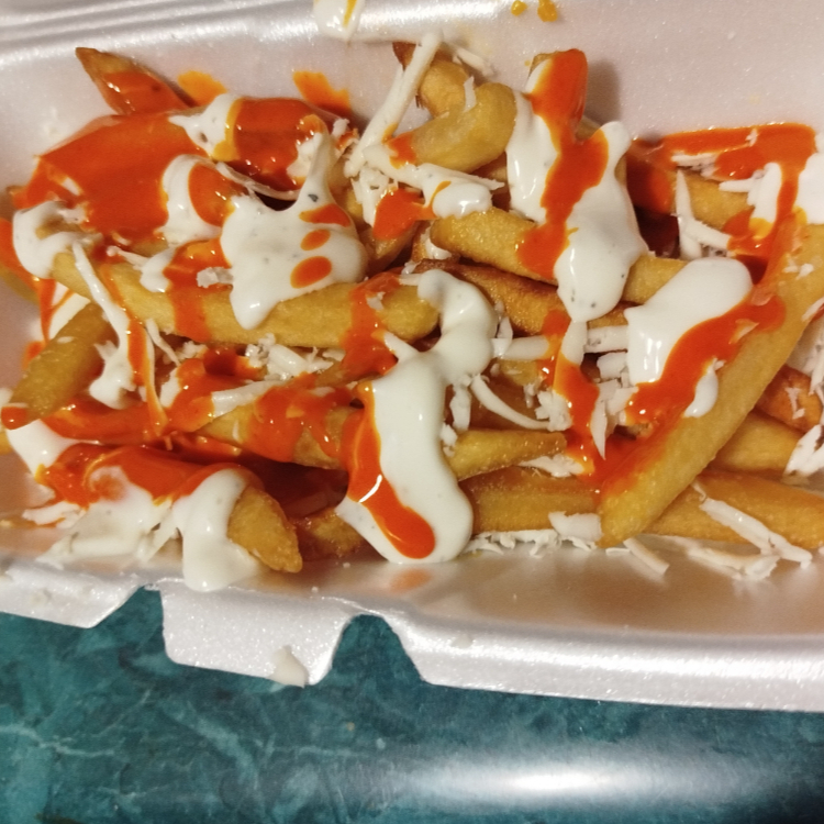 Deliciosas papas fritas con queso menonita bañadas con búfalo y ranch