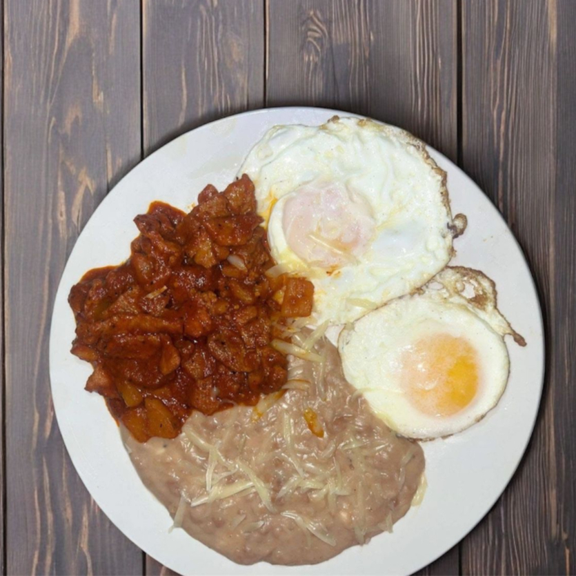 2 Huevos (estrellados o revueltos) + 1 guiso a elegir + 1 porcion de frijoles con queso