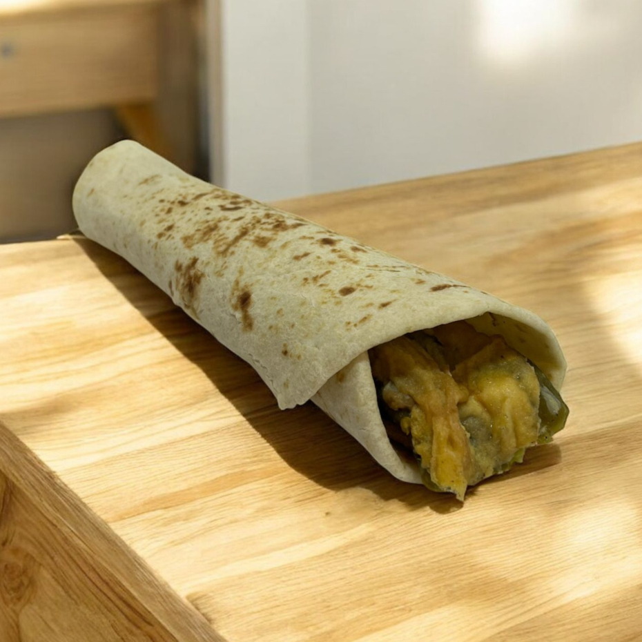 Burrito de harina relleno con guiso de huevo con jamón.