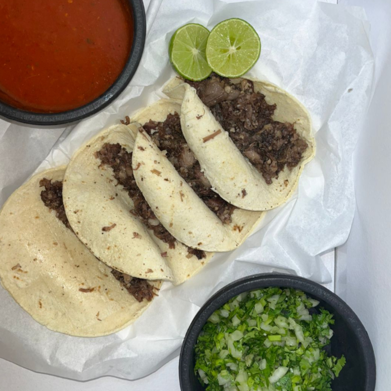 Porción de cebolla, cilantro , limón, salsa y tortillas.