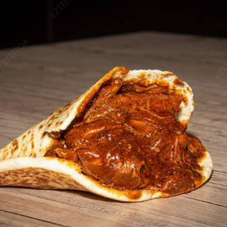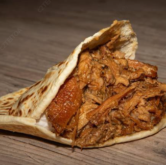 Gordita de harina o maíz rellena de deshebrada en rojo.