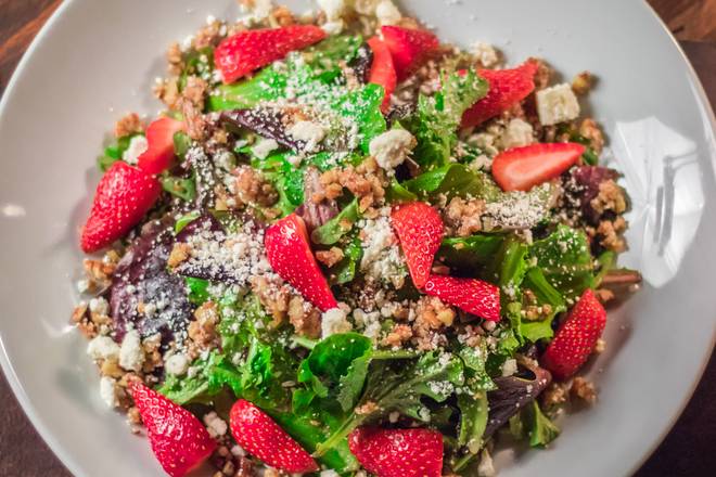 Mix de lechugas frescas, queso feta y nuez caramelizada con vinagreta de fresas ahumadas. 364 gramos.