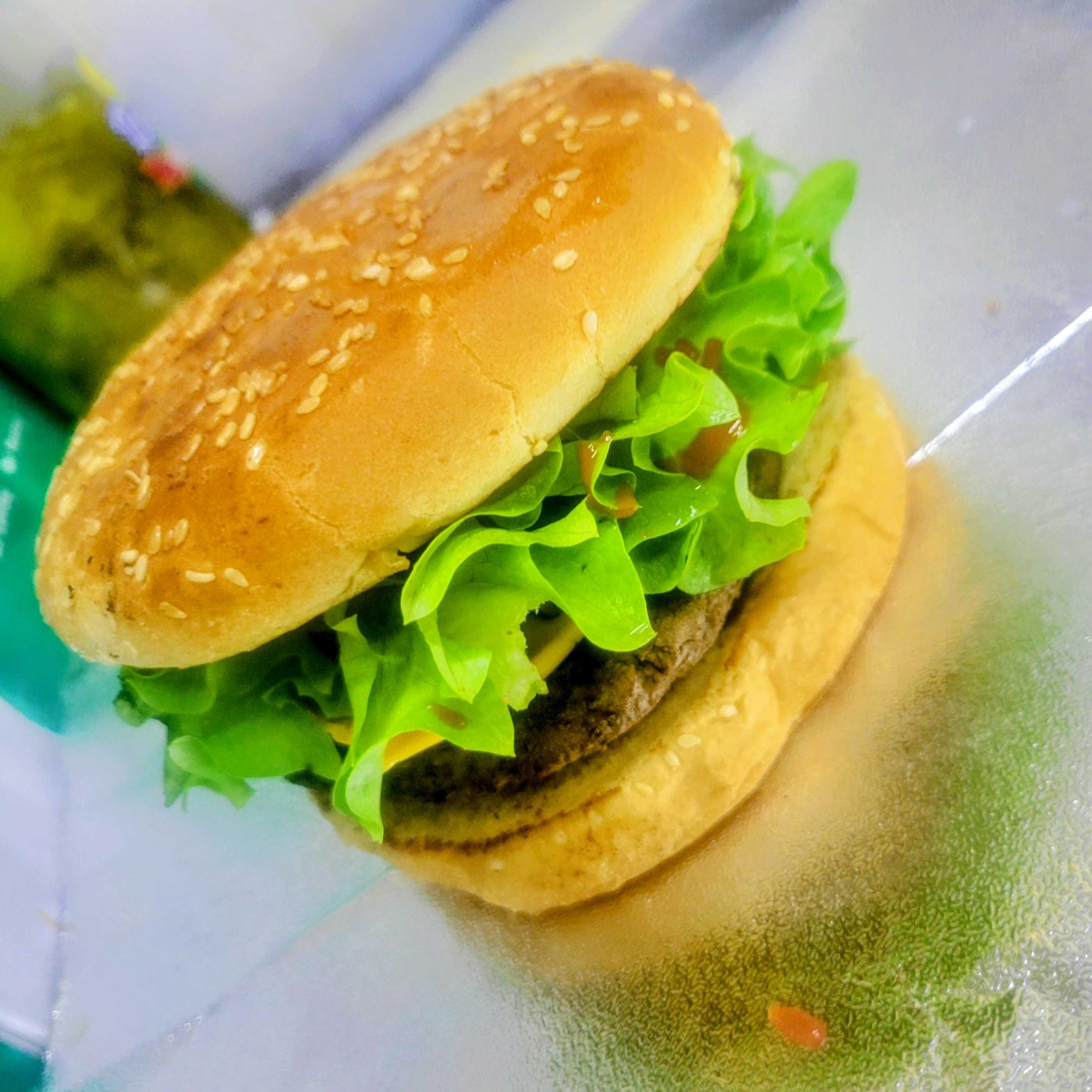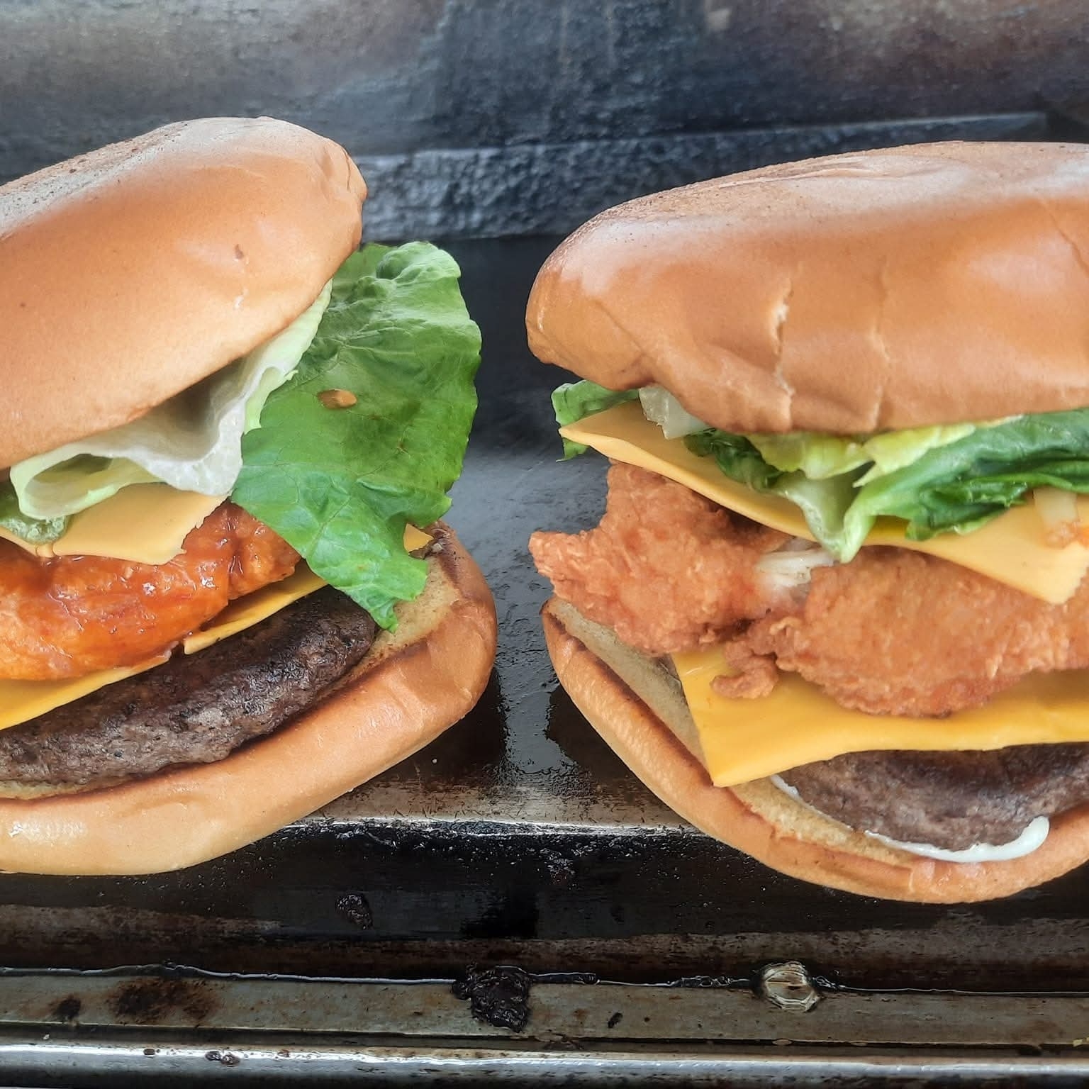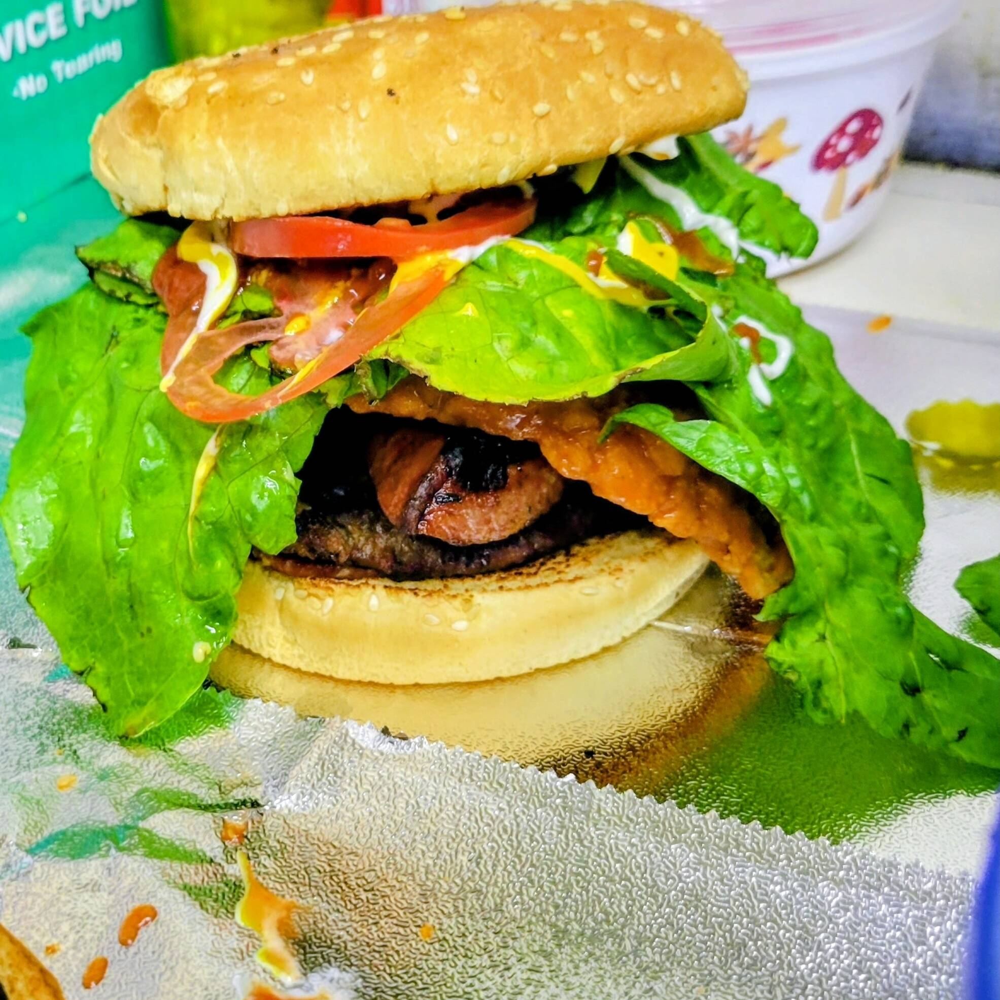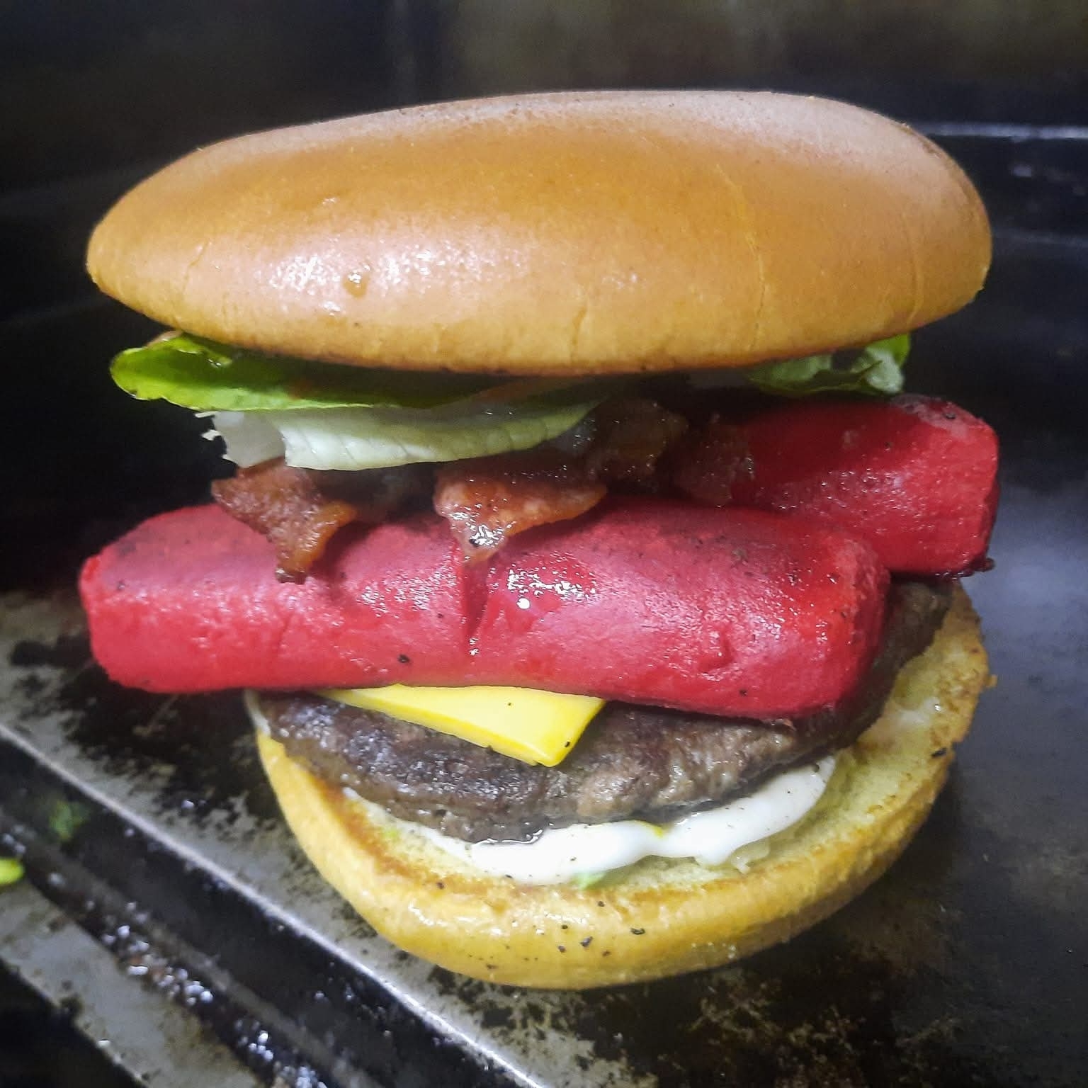 DONBLE CARNE TOCINO WINNIE QUESO LECHUGA TOMATE CEBOLLA PEPINILLOS LIQUIDOS