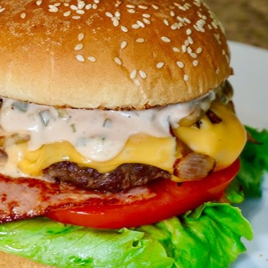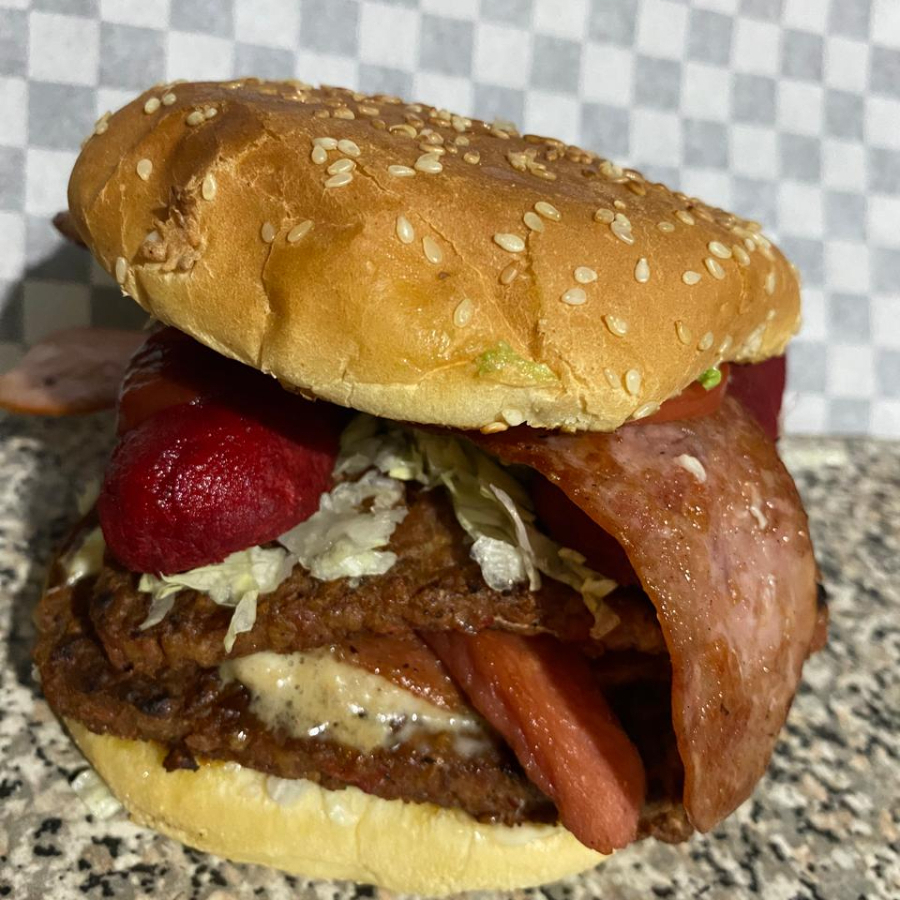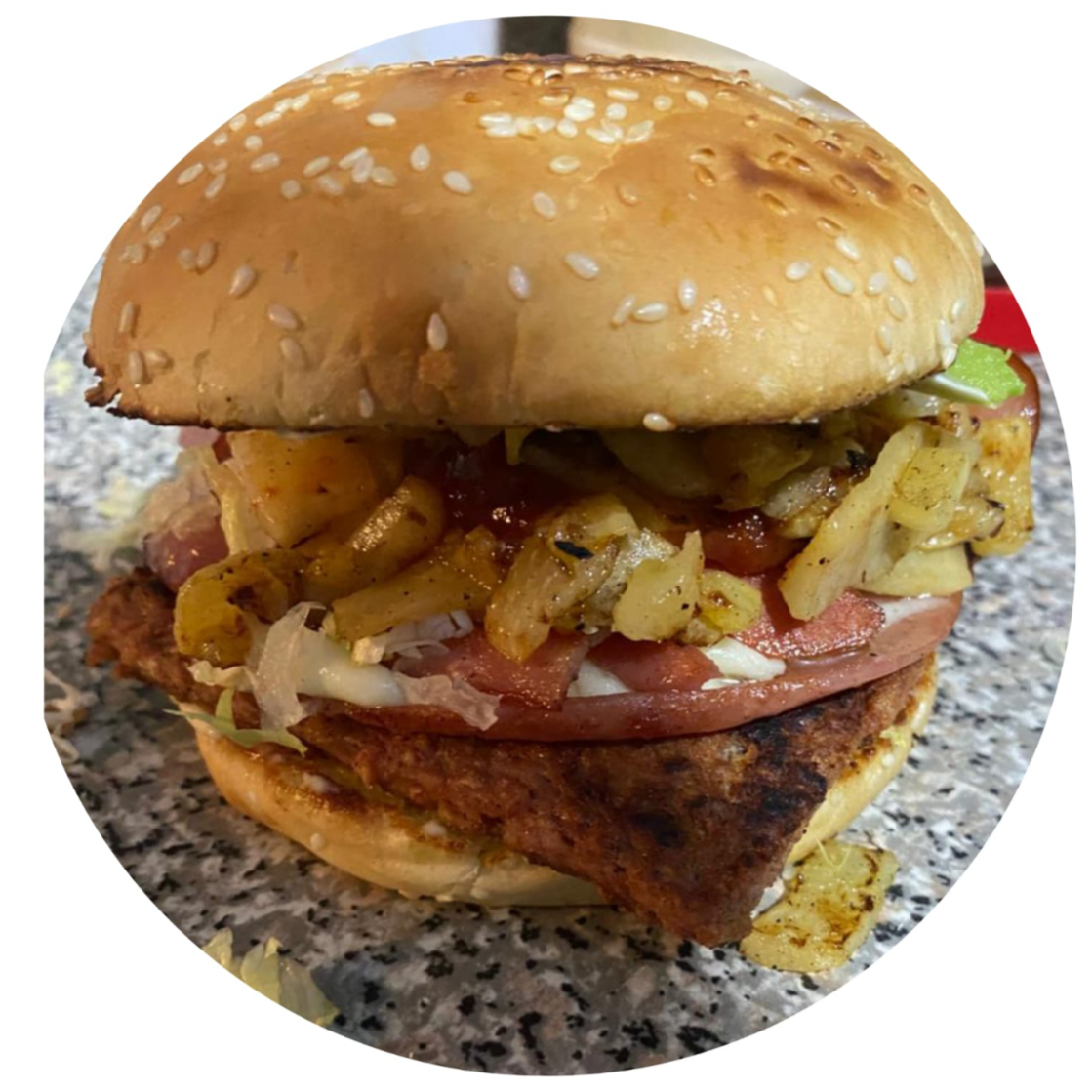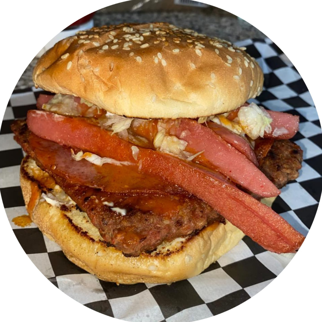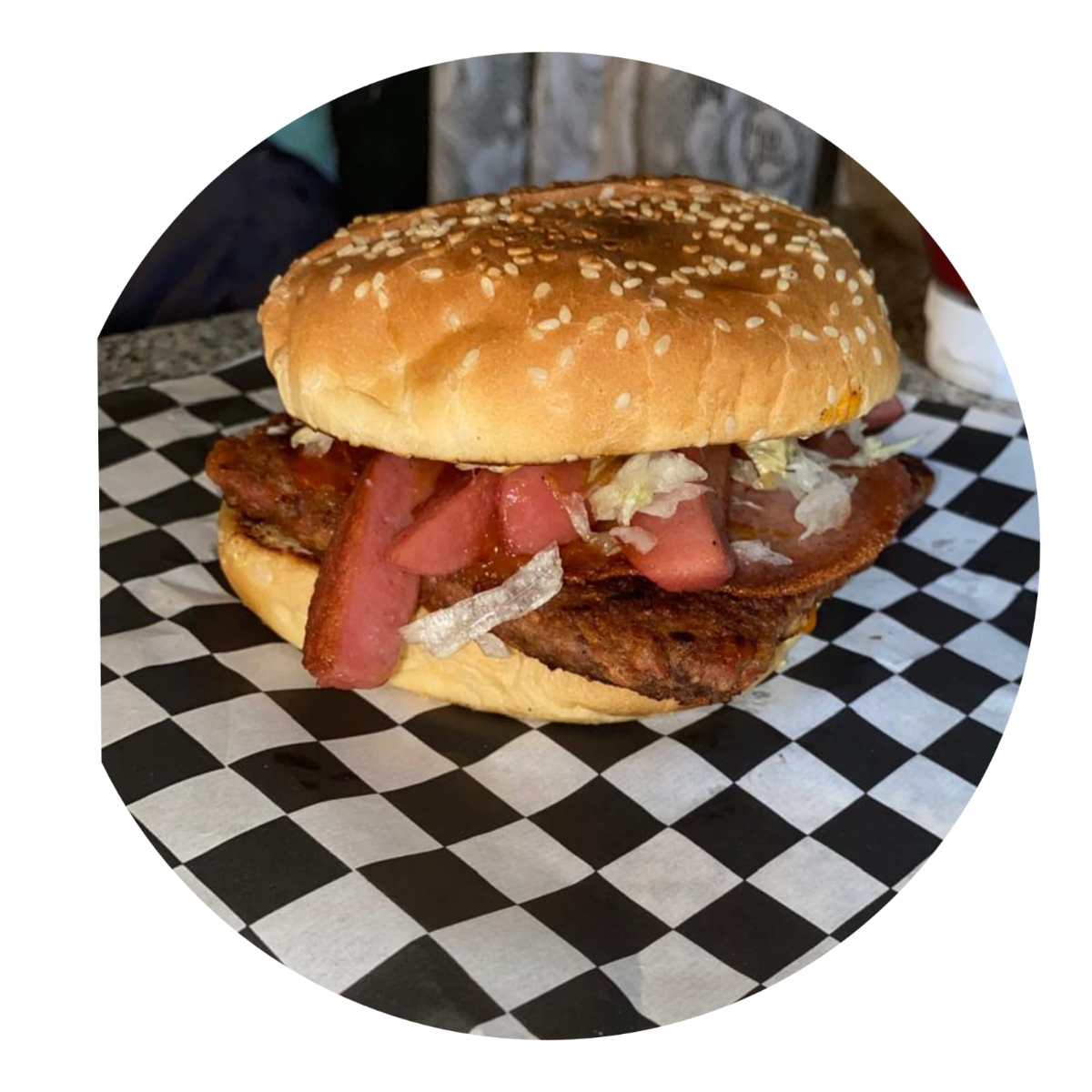 carne,piña tatemada,jamon,queso blanco, tocineta ,aguacate, lechuga, tomate, cebolla tatemada, liquidos.