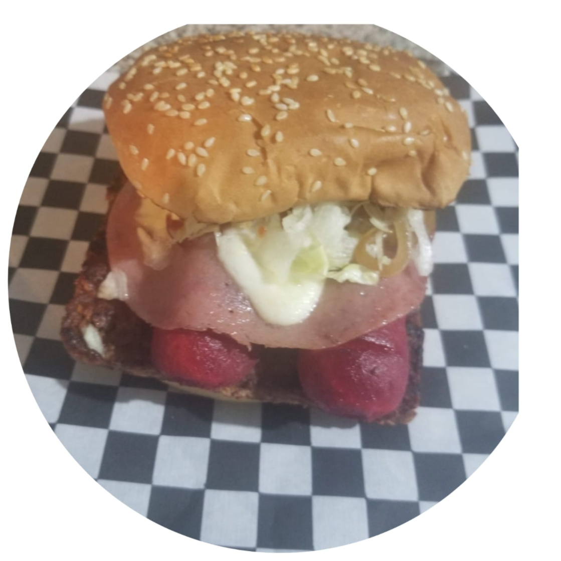 carne bañada en bbq, winni, jamon, queso, lechuga, tomate, cebolla tatemada, liquidos