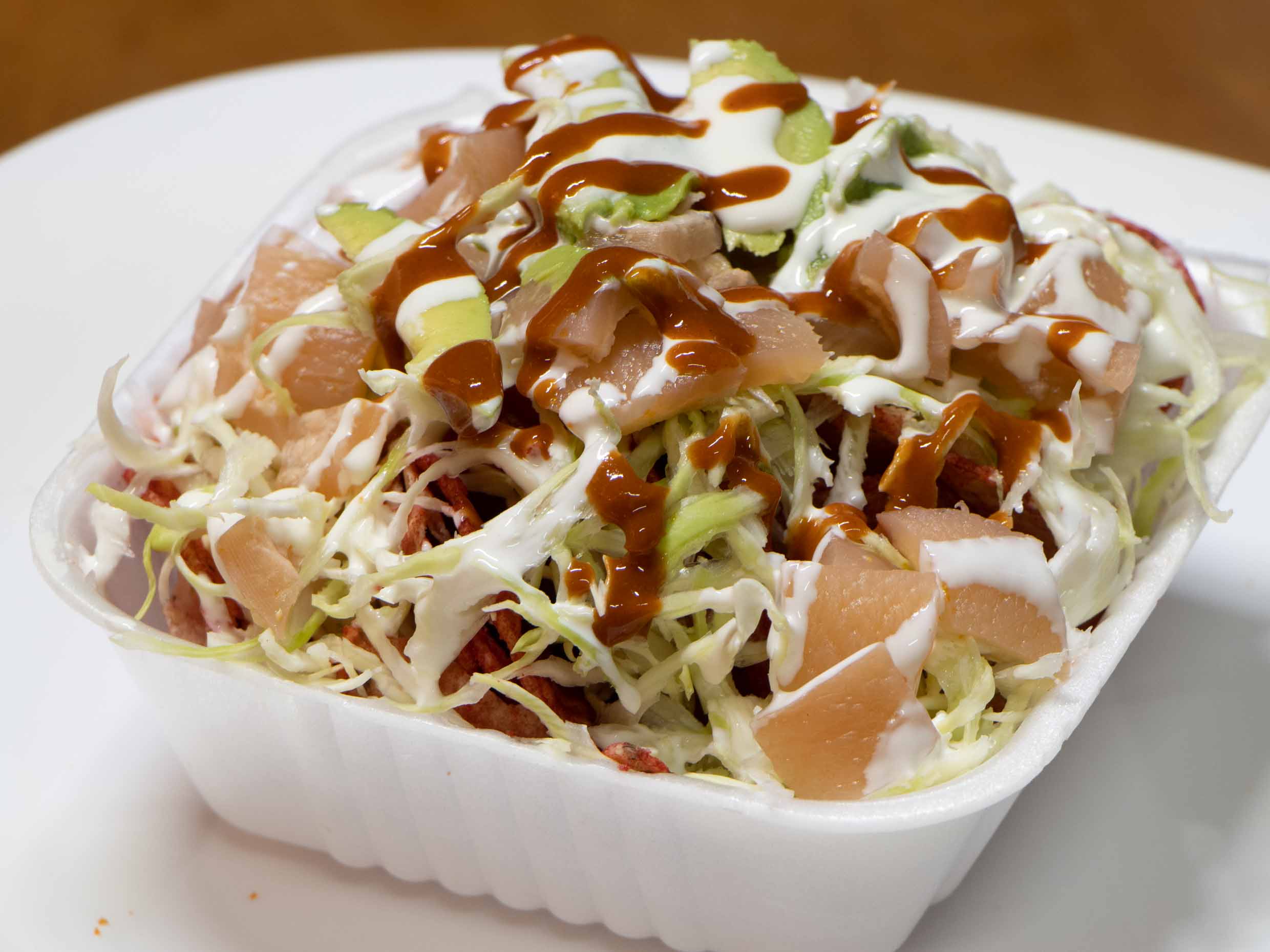 Chicharrón, repollo, crema, aguacate, cueritos y Valentina.