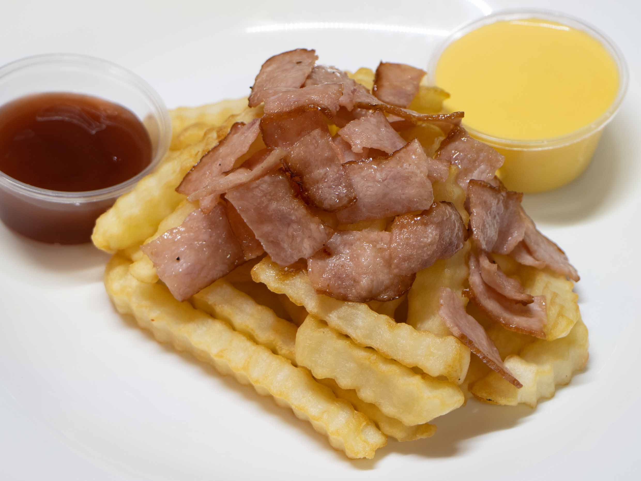 Deliciosas papas fritas con tocino en trozos y queso amarillo.