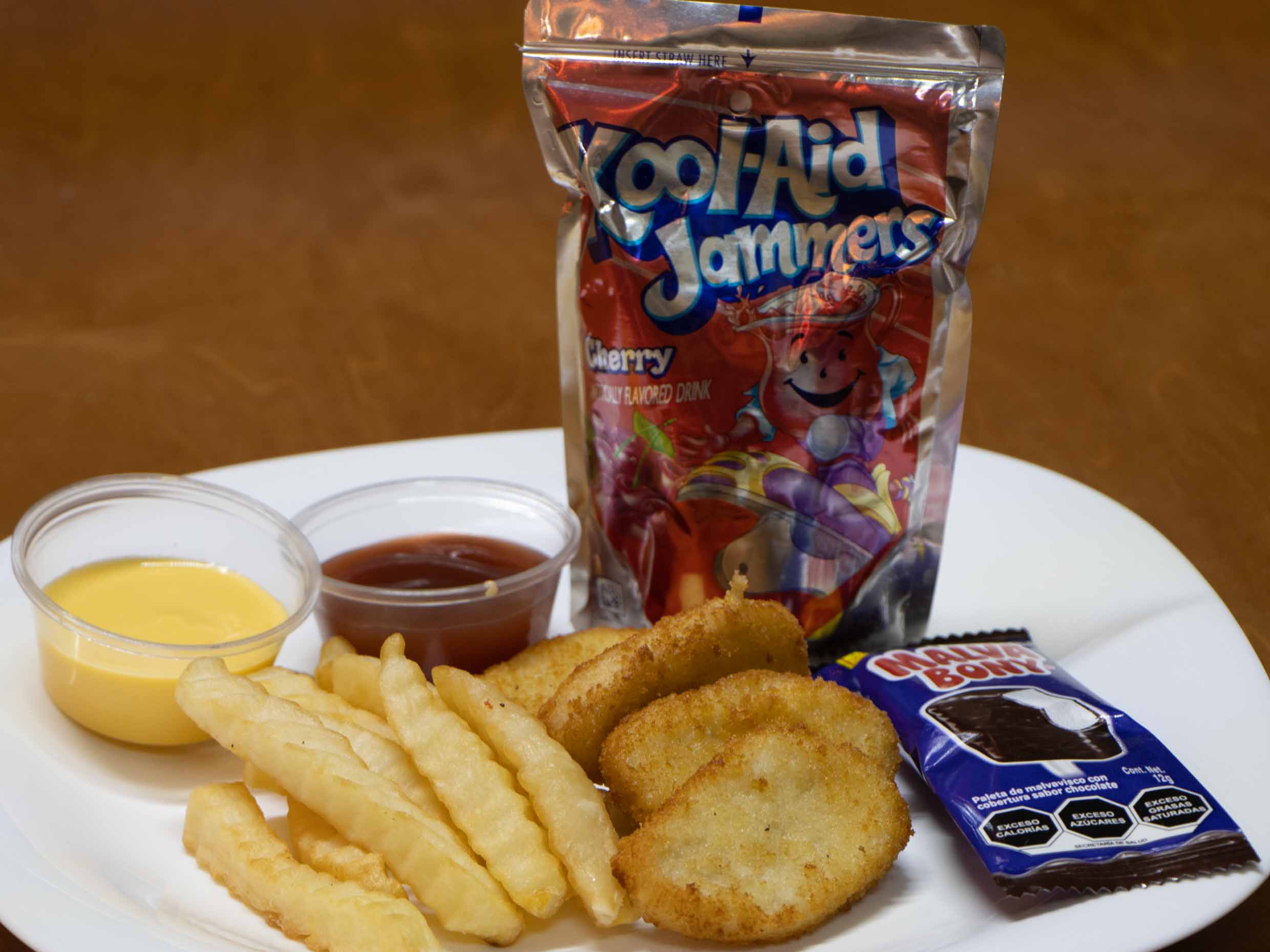 4 Nuggets con papas fritas con queso de nachos o cátsup a escoger con paleta de chocolate y jugo.