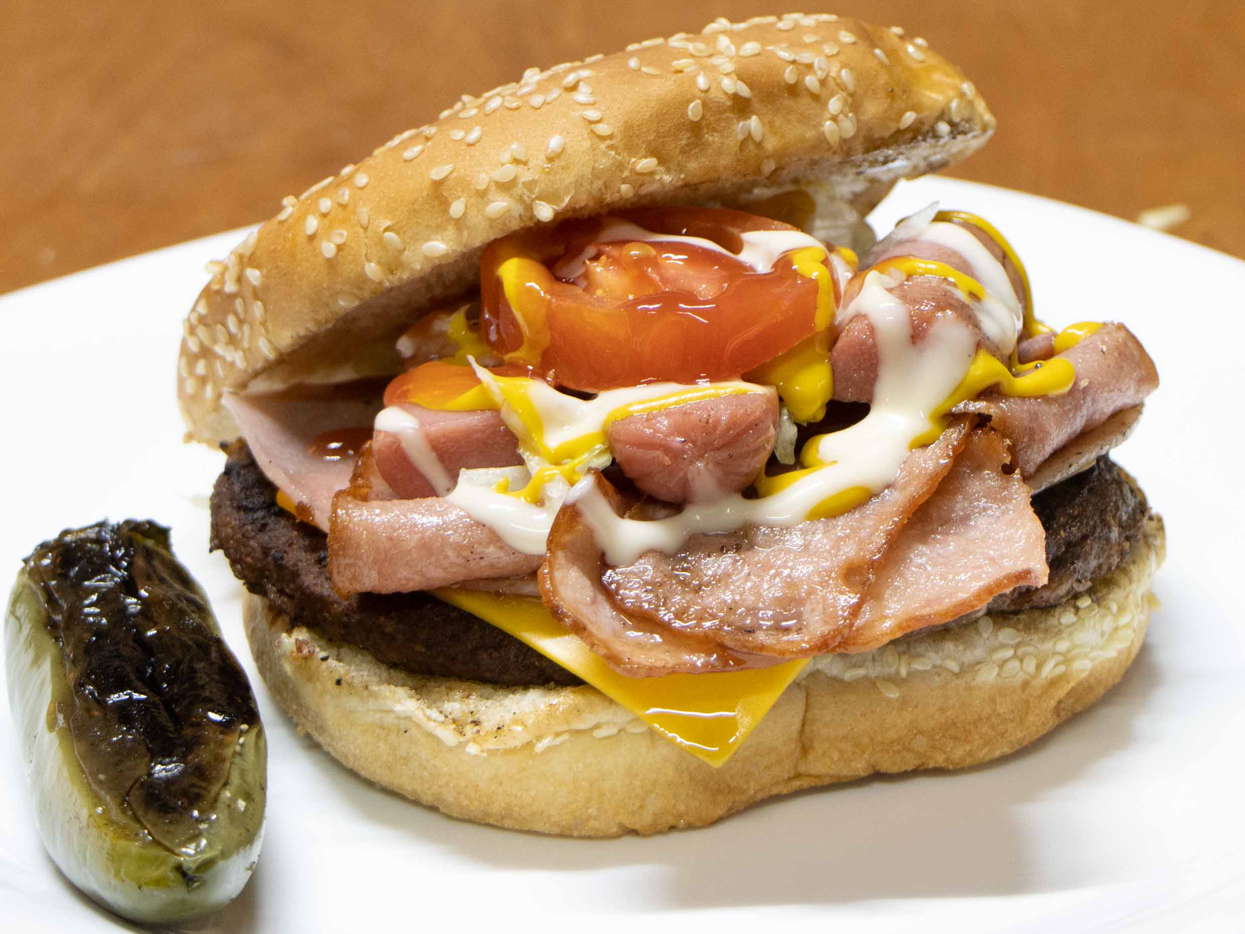 Deliciosa hamburguesa con carne, queso, winnie, jamón y tocino.