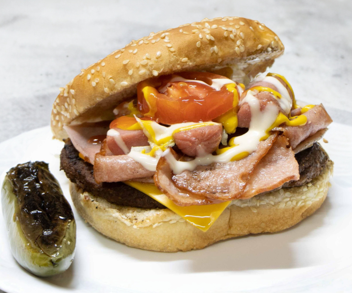 Deliciosa hamburguesa con carne, queso, winnie, jamón y piña.