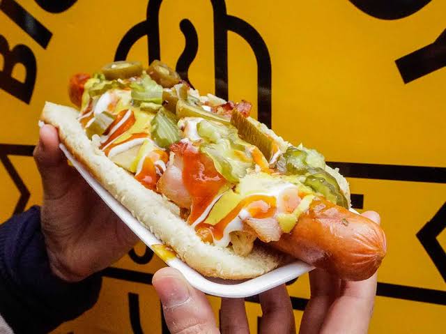 Hot dog con salchicha de res, tocino, Doritos y queso de nachos.