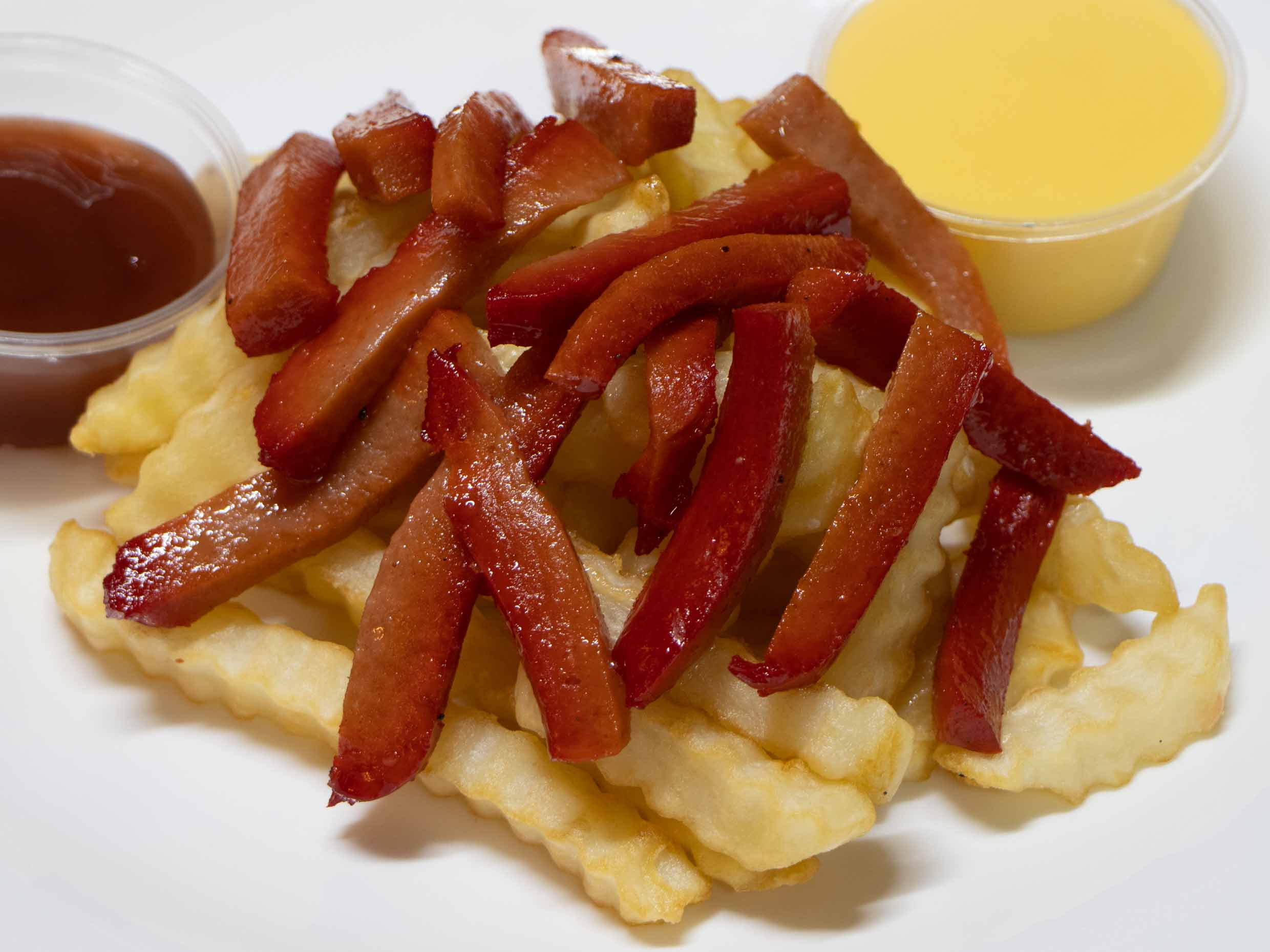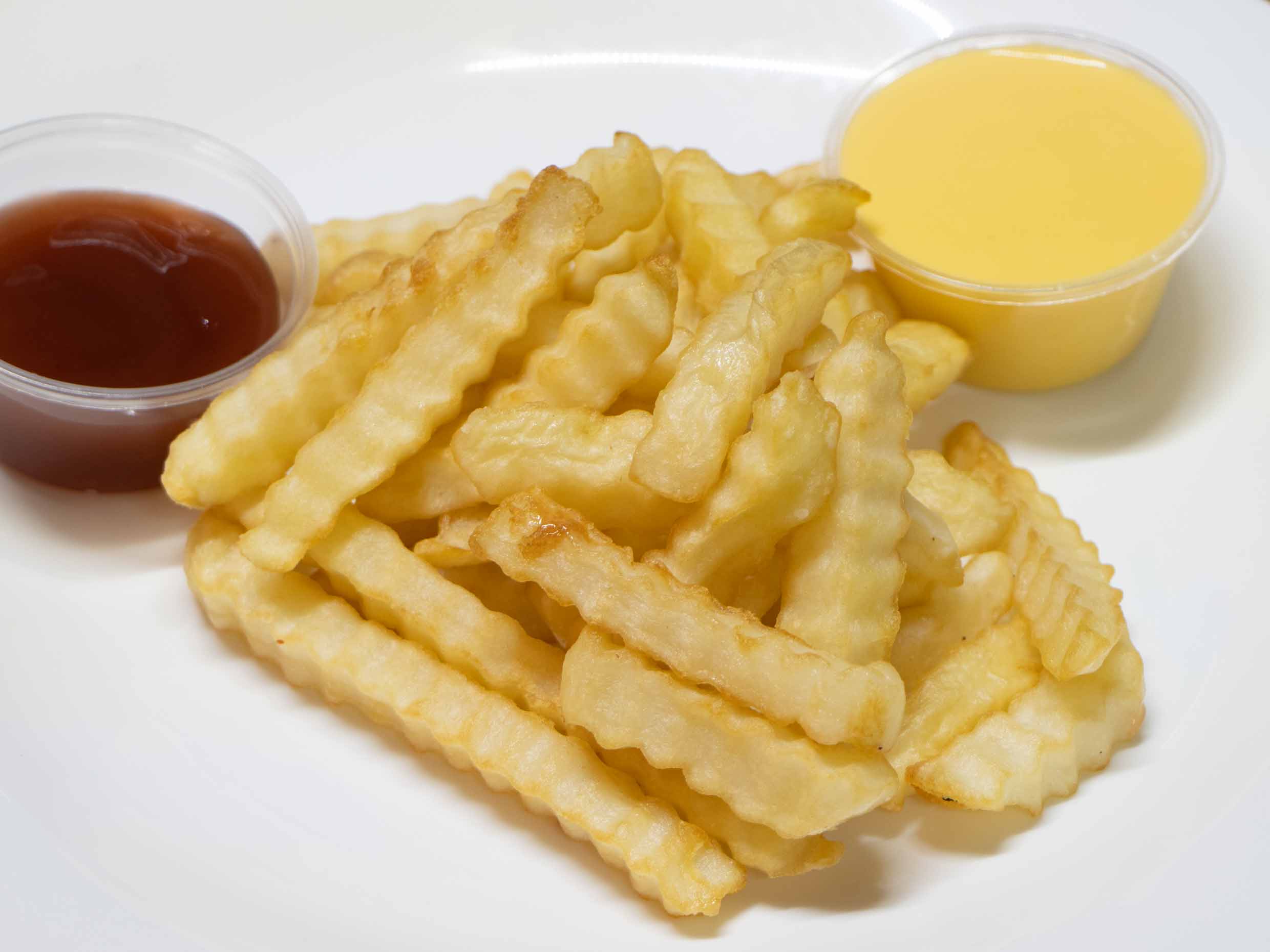 Papas fritas con queso de nachos o cátsup a escoger.