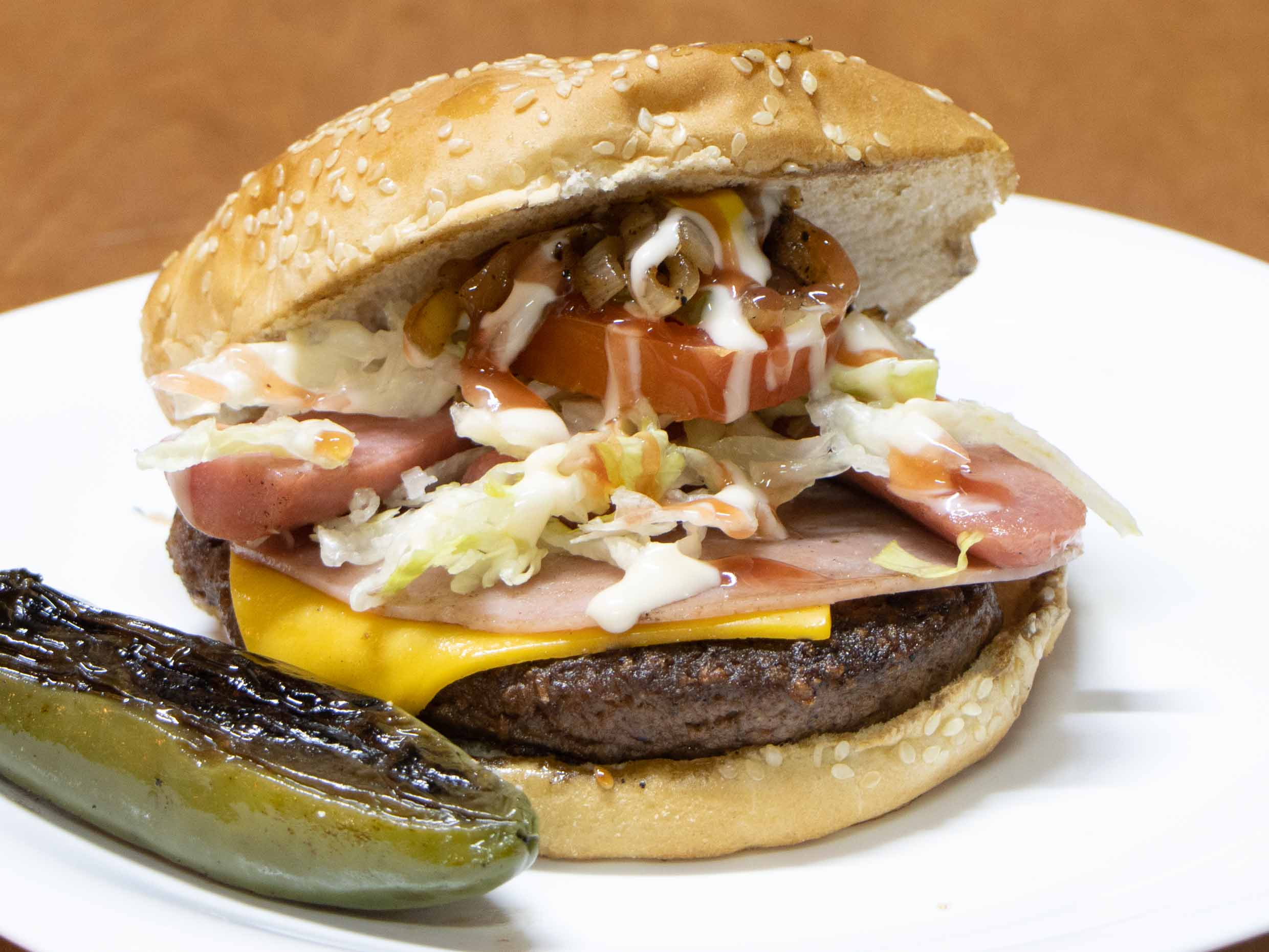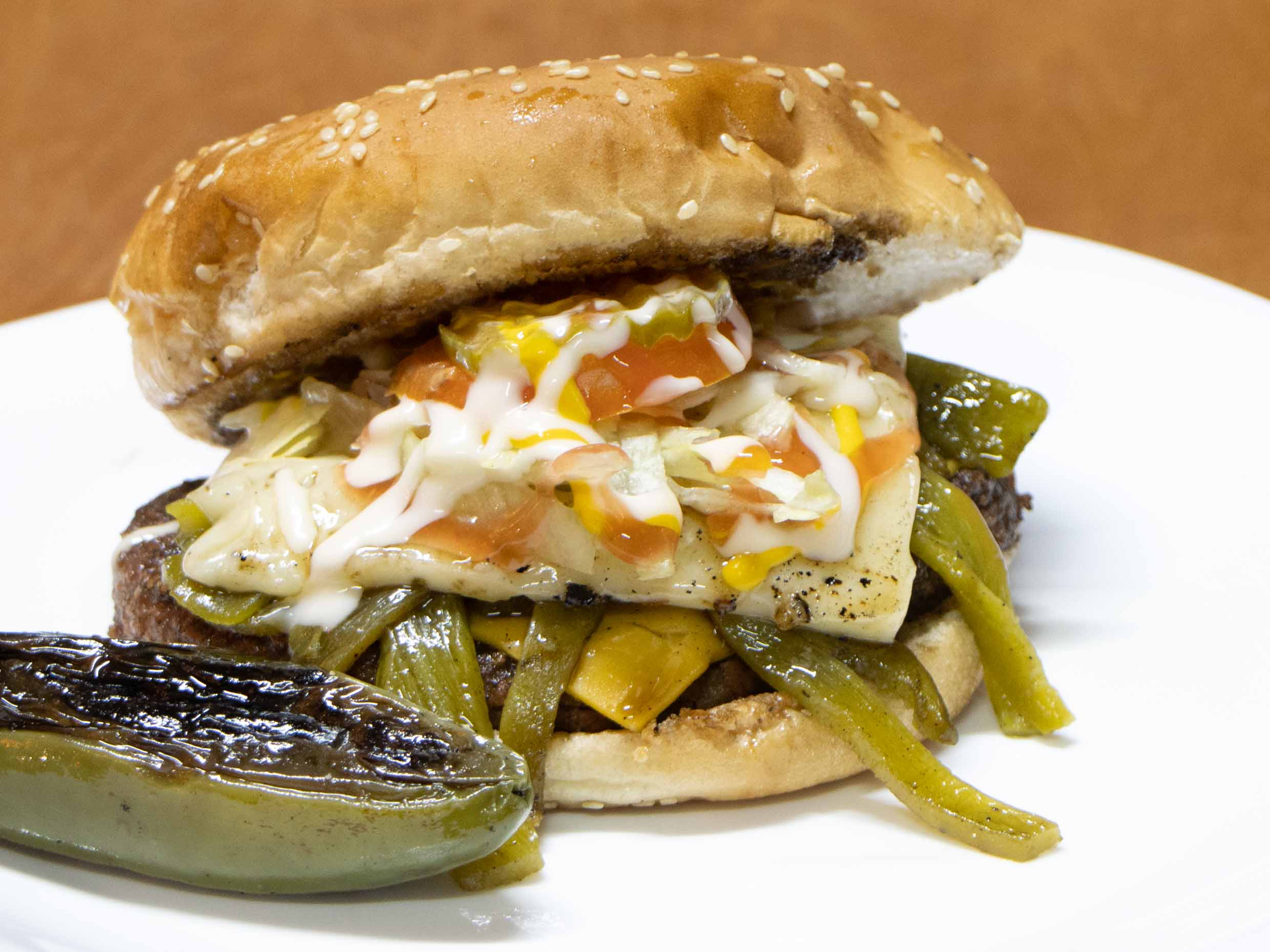 Deliciosa hamburguesa con chile california rallado y queso blanco fundido.