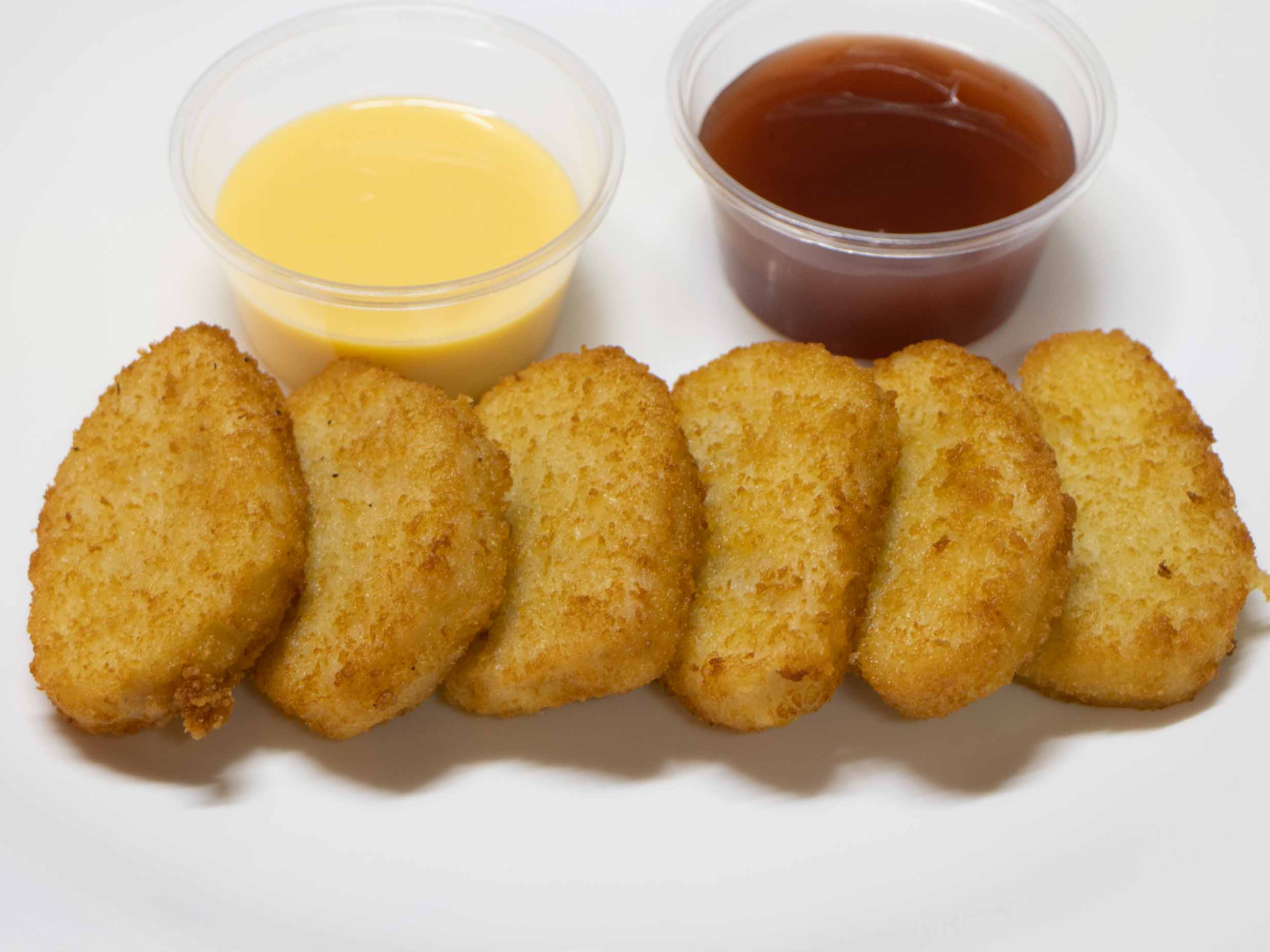 6 Nuggets fritos con queso de nachos o cátsup para acompañar.